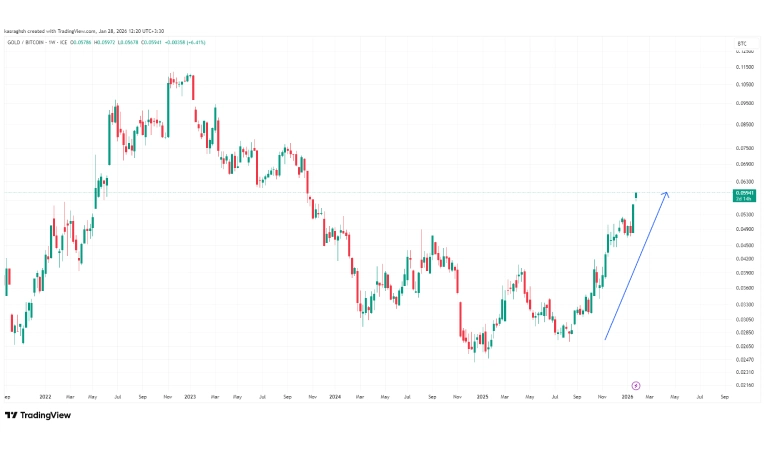 چارت زیر نسبت طلا به بیت کوین را در تایم فریم هفتگی نشان می‌دهد. این رشد اخیر چارت XAUBTC در هفته‌های اخیر مهر تاییدی است بر این تحلیل که ریسک‌‌گریزی در نگاه سرمایه گذران شکل گرفته و در این مدت جریان سرمایه به سمت دارایی‌های امن بوده است.