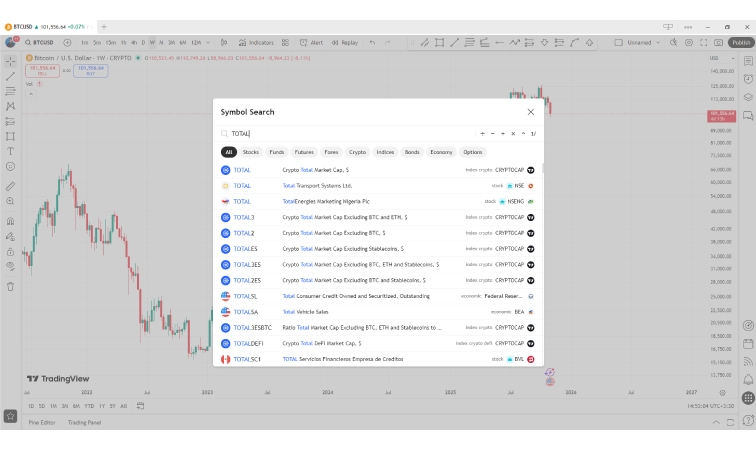 تریدینگویو این امکان را میدهد که چند نمودار را روی هم مقایسه کنید. مثلاً میتوانید TOTAL و BTCUSD را با هم نمایش دهید تا بفهمید آیا افزایش شاخص توتال ناشی از رشد بیتکوین است یا سرمایه وارد آلتکوینها شده است.