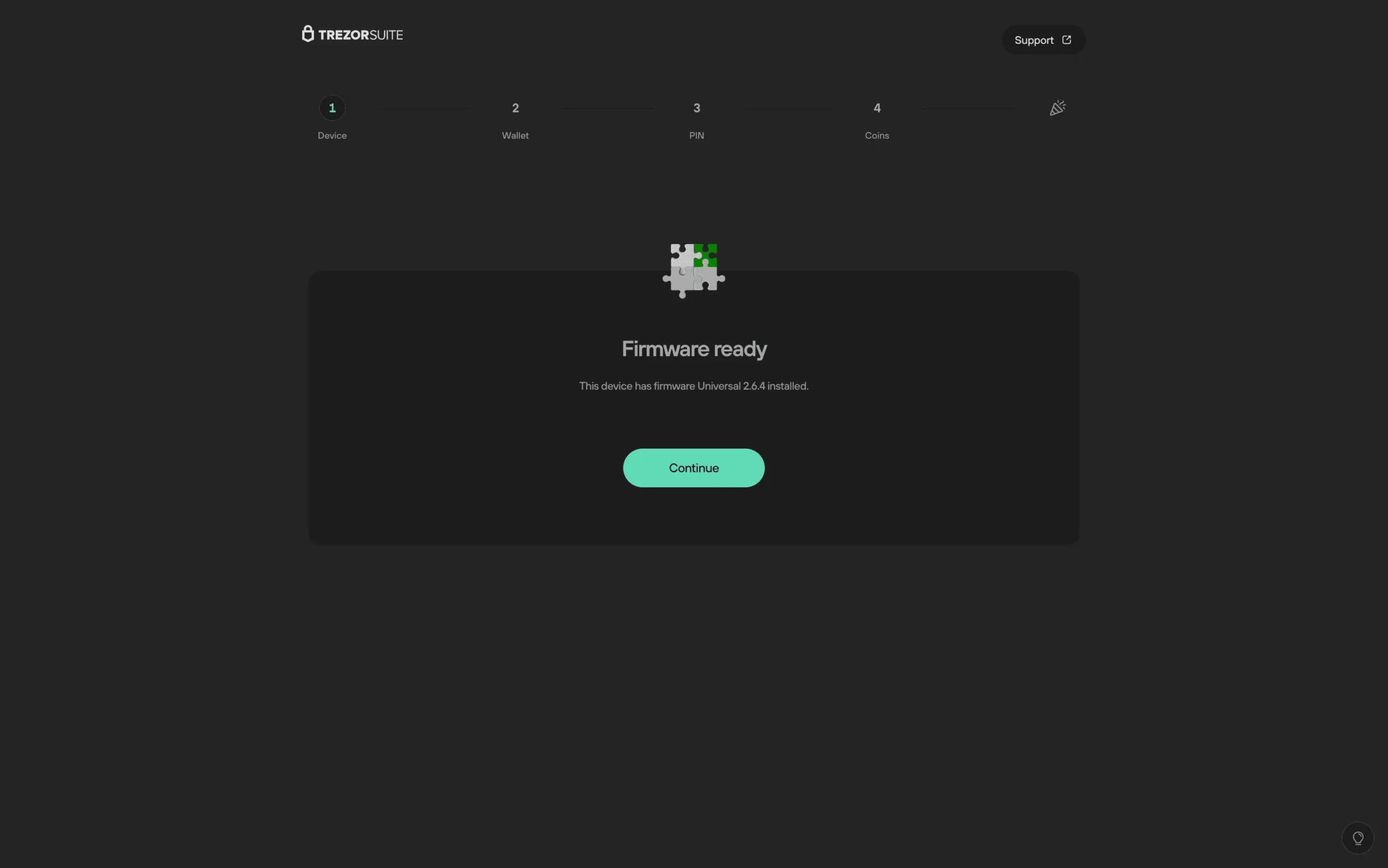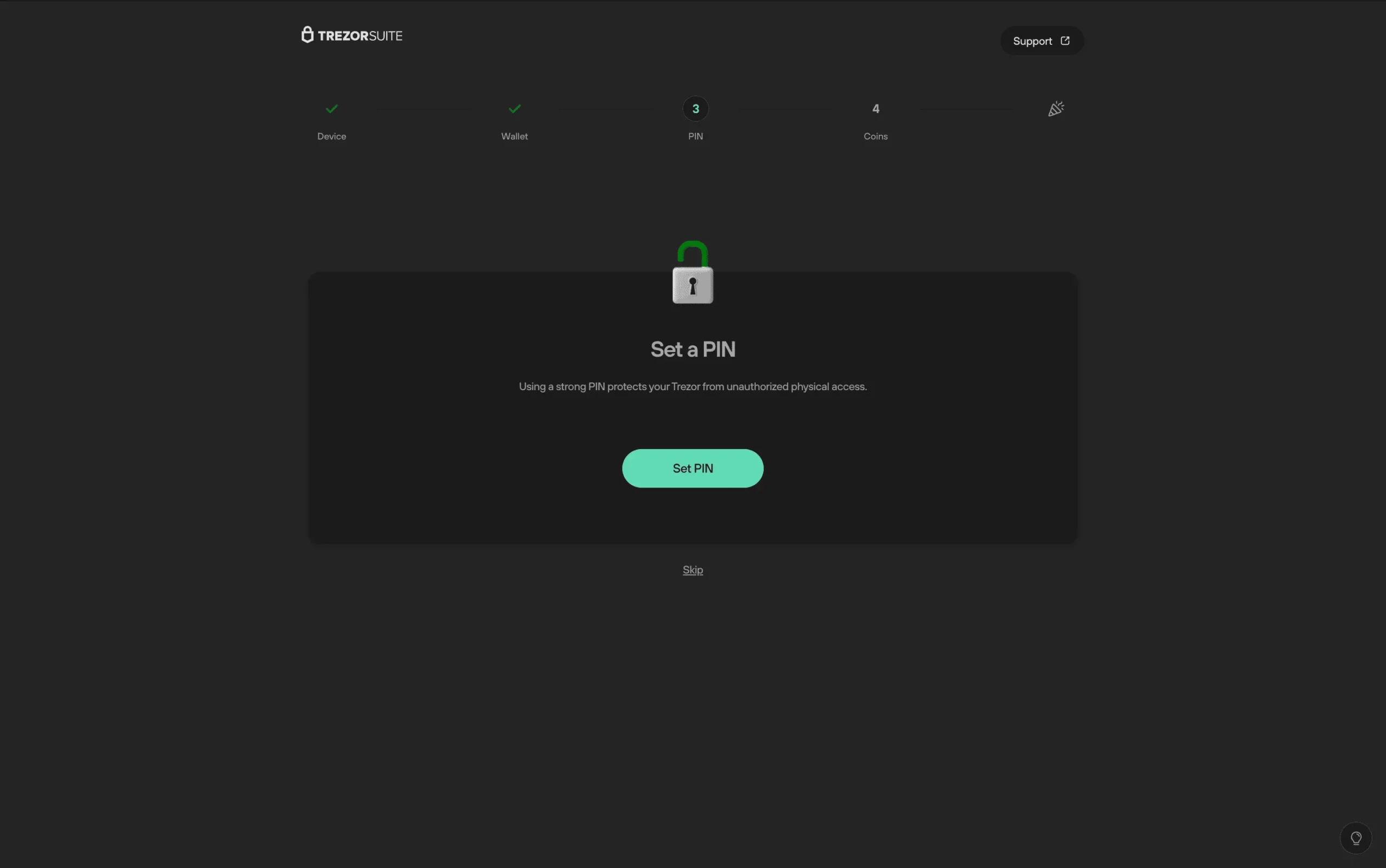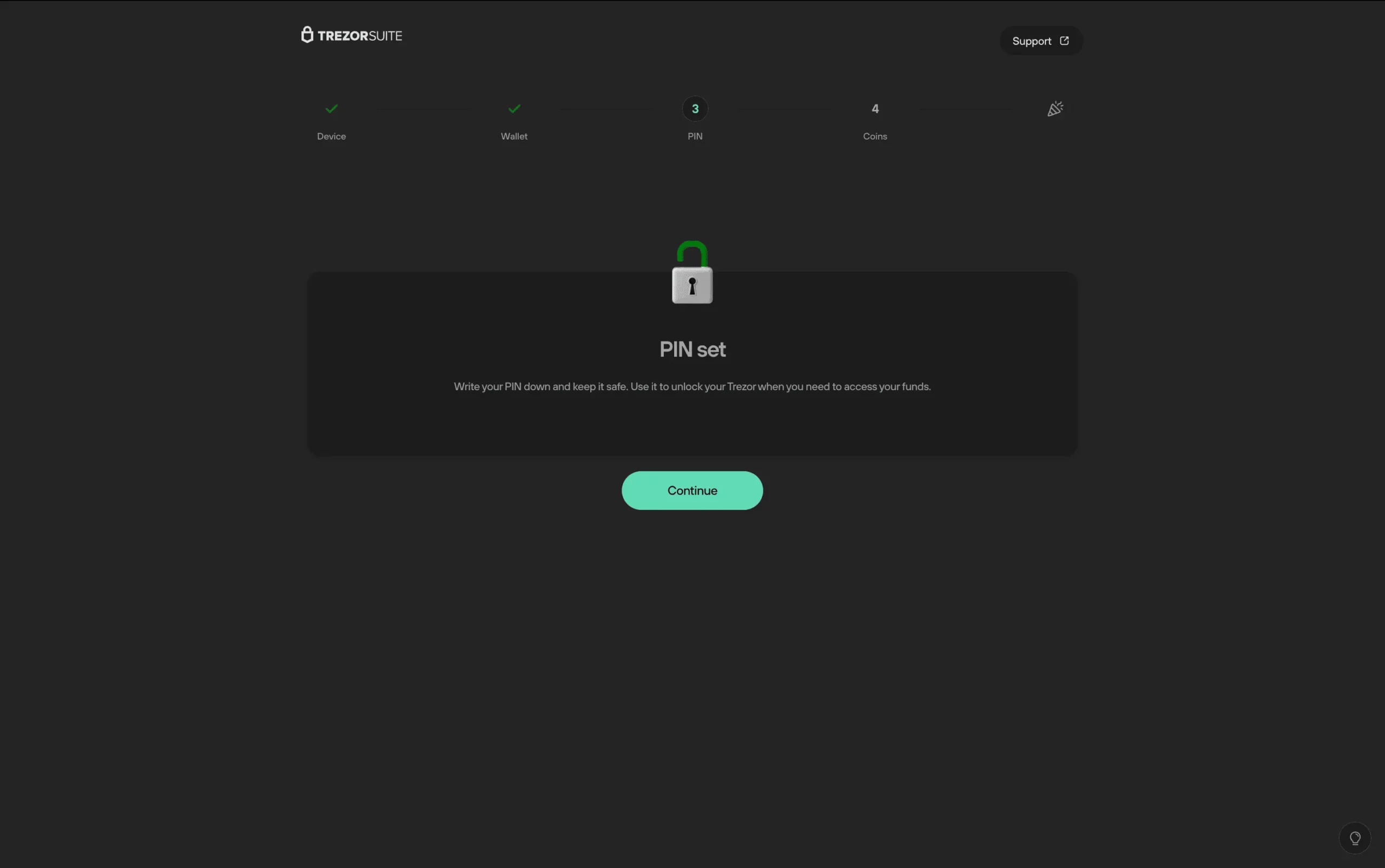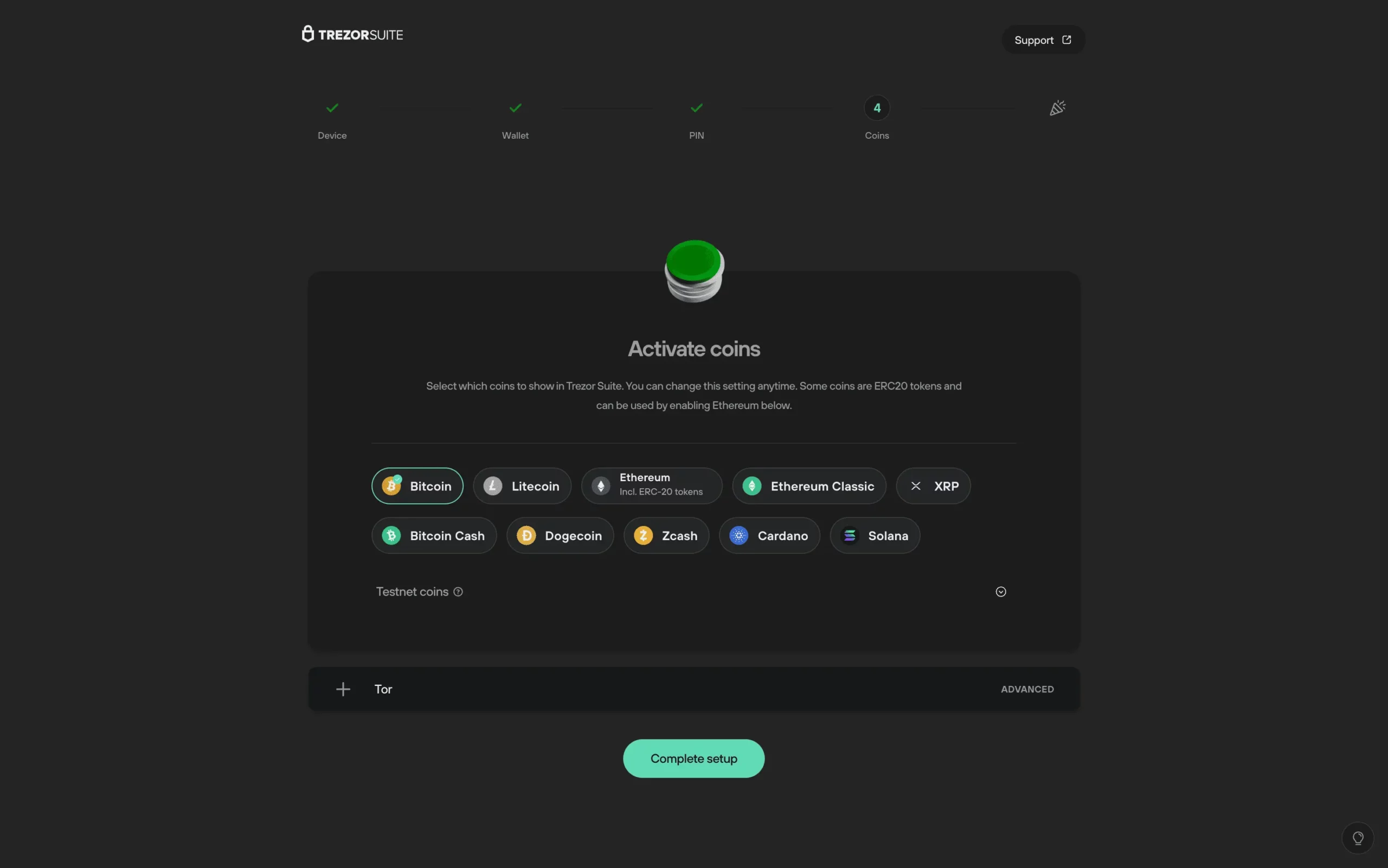 سپس نرمافزار پیغام PIN set را نمایش میدهد. روی Continue کلیک کنید تا به مرحلهی فعالسازی رمزارزها برسید. در صفحهی Activate Coins میتوانید انتخاب کنید کدام ارزها در Trezor Suite نمایش داده شوند. پس از انتخاب، روی Complete setup بزنید.