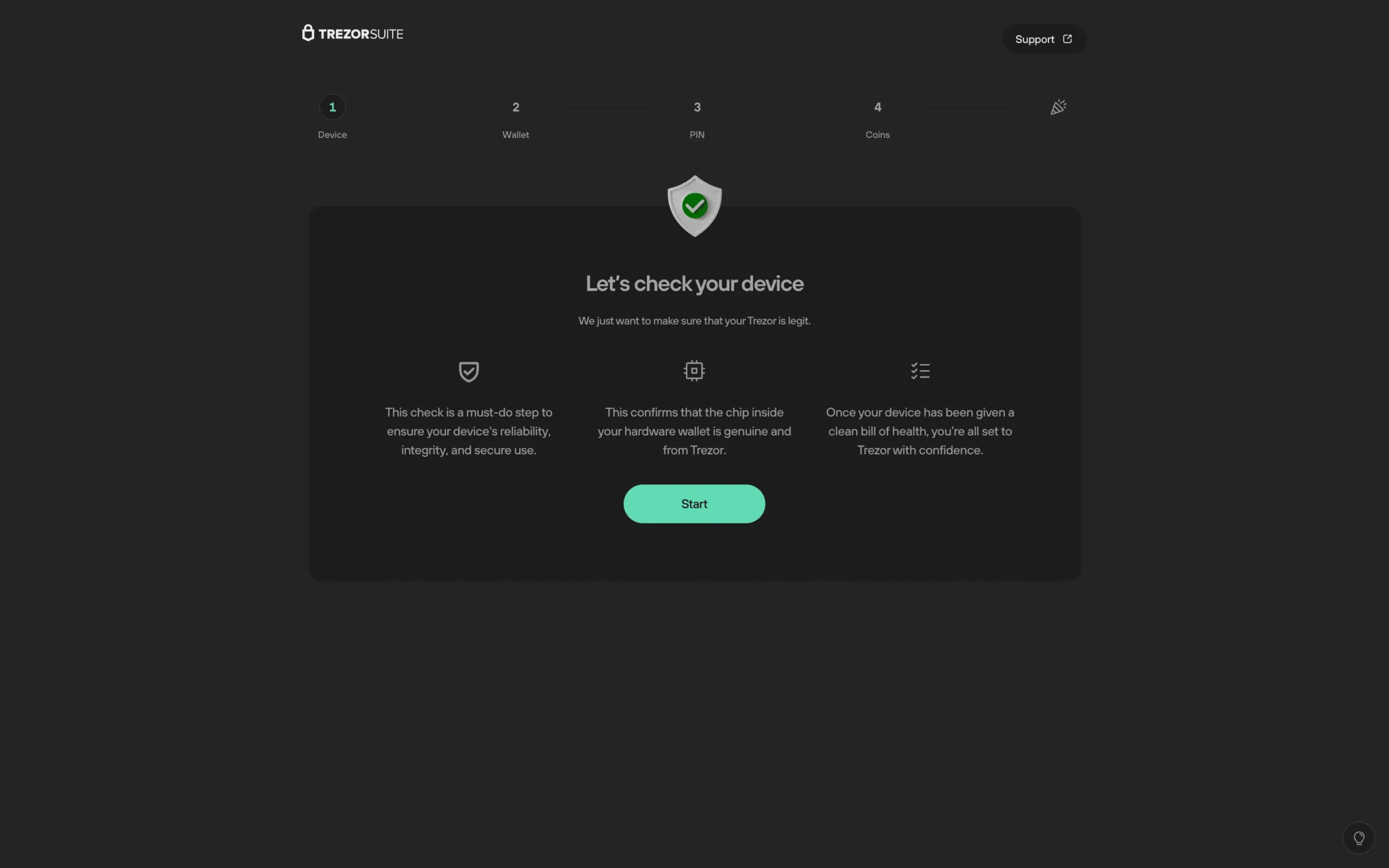 در صفحهی بعد گزینهی Let’s check your device نمایش داده میشود. این مرحله برای اطمینان از اصالت و امنیت ترزور شما ضروری است. روی Start کلیک کنید. دستگاه از شما میخواهد گزینهی Allow را انتخاب کنید تا احراز هویت انجام شود.