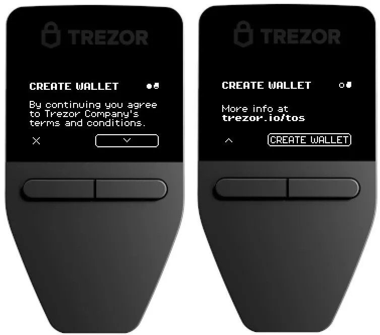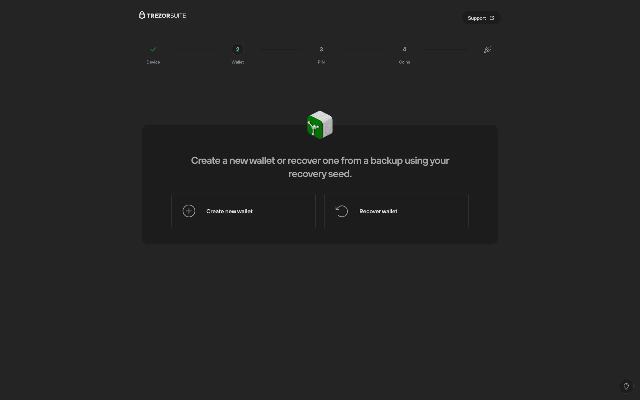در مرحلهی بعد اگر برای نخستینبار از ترزور استفاده میکنید، گزینهی Create new wallet را انتخاب کنید. گزینهی Recover wallet مخصوص افرادی است که قبلاً بکاپ (Recovery Seed) دارند و قصد بازیابی کیف پول پیشین را دارند.