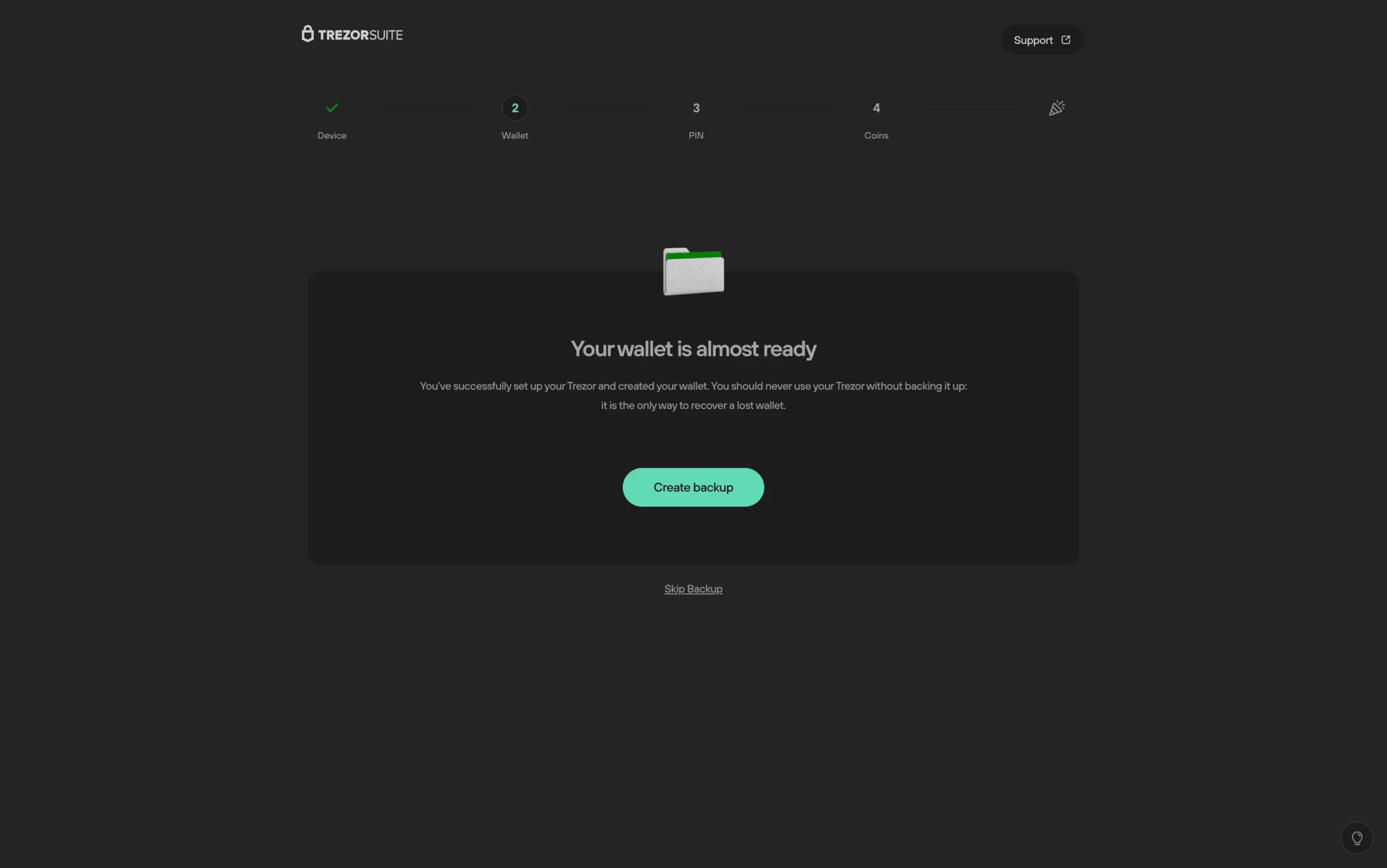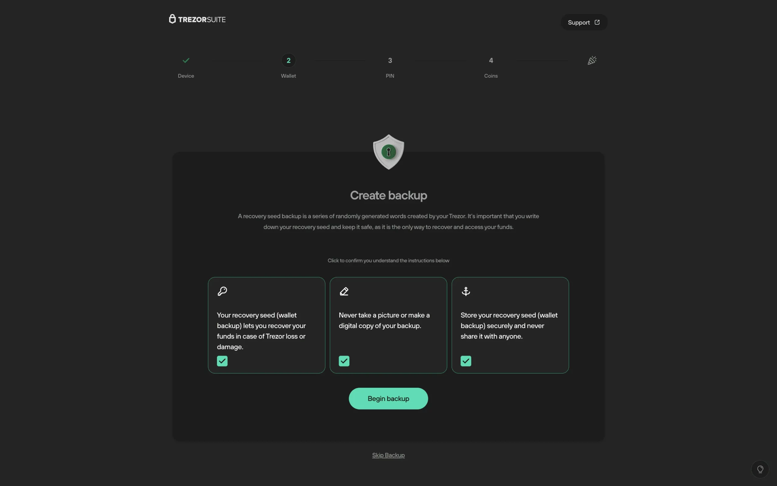 اکنون باید نسخهی پشتیبان (recovery seed) را ایجاد کنید. روی Create backup کلیک کنید. پیش از شروع، دستورالعملهای امنیتی را مطالعه کرده و زمانیکه تمام موارد با علامت سبز تأیید شدند، روی Begin backup بزنید.