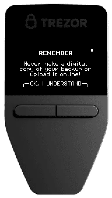 دستگاه از شما میخواهد تأیید کنید که از کلمات بازیابی نسخهی دیجیتال تهیه نمیکنید. گزینهی OK, I understand را با هر دو دکمه انتخاب کنید. سپس دستگاه فهرستی از کلمات بازیابی (بر اساس استاندارد BIP39) را نمایش میدهد. این کلمات را بهترتیب روی کارت مخصوص یادداشت کنید و با هیچکس به اشتراک نگذارید.