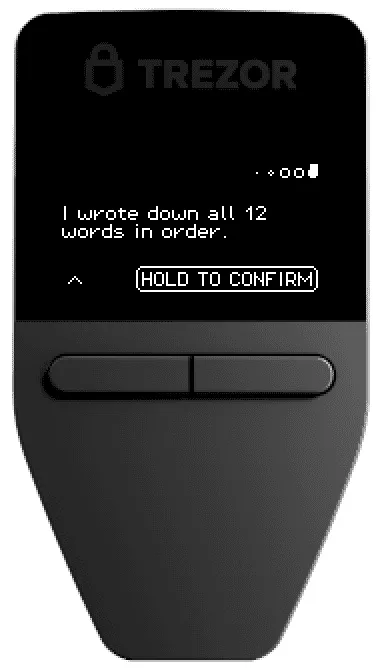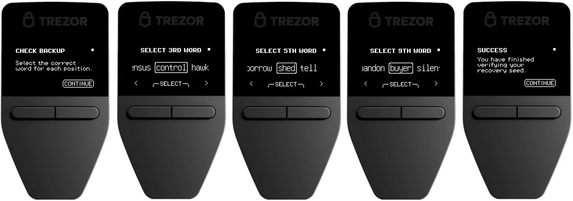 در نسخهی سال ۲۰۲۳، این فهرست شامل ۱۲ کلمه و در دستگاههای تولید ۲۰۲۴ به بعد ۲۰ کلمه است. پس از نوشتن همهی کلمات، گزینهی Hold to confirm را نگه دارید تا تأیید شود. سپس باید چند کلمهی تصادفی را طبق دستور دستگاه انتخاب کنید تا صحت بکاپ بررسی شود. پس از موفقیت، پیام You have finished verifying your recovery seed نمایش داده میشود.