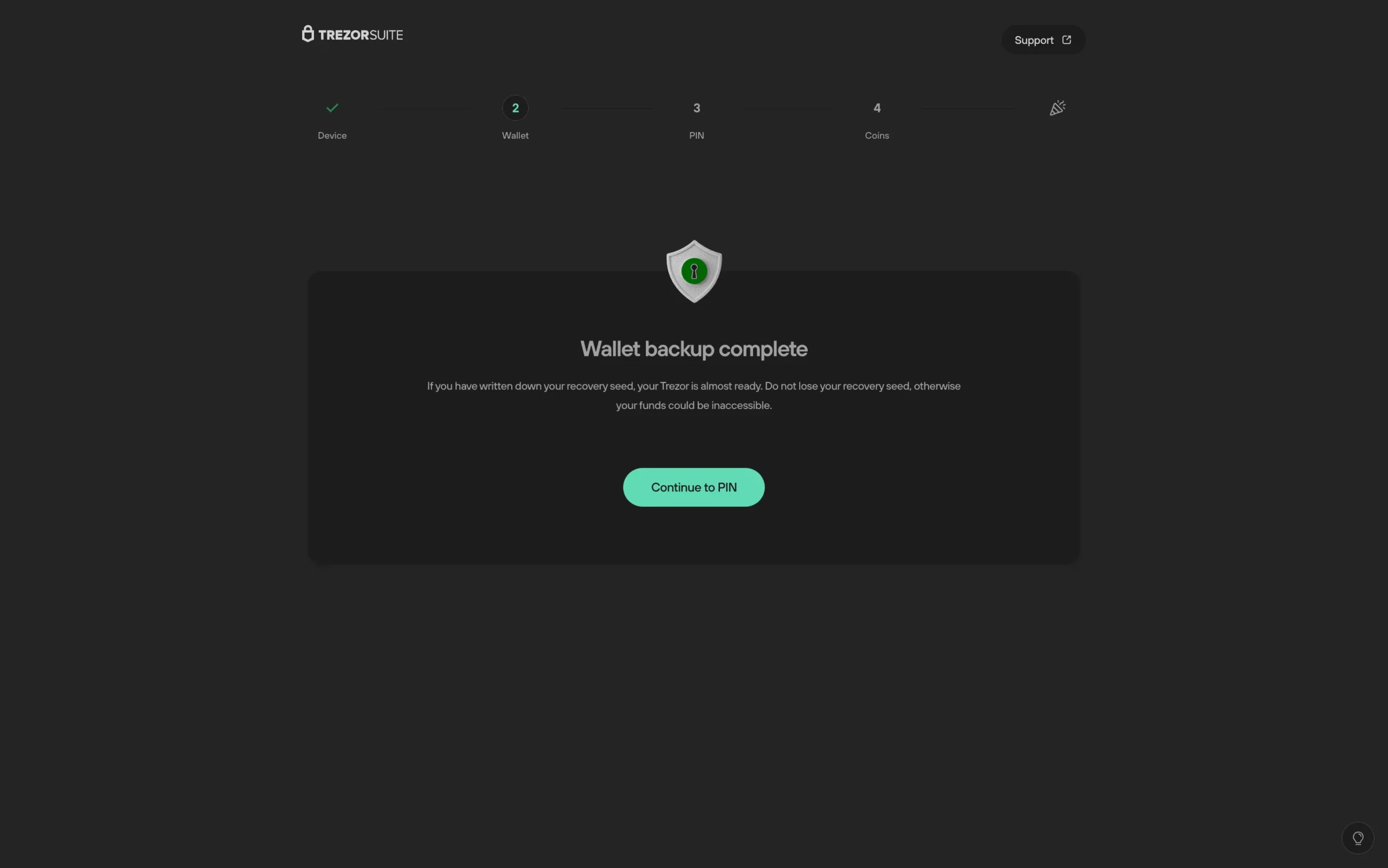 پس از اتمام، پیام PIN protection turned on نمایش داده میشود. میتوانید در صورت تمایل PIN را در کارت پشتیبان یادداشت کنید، اما هرگز آن را بهصورت آنلاین ذخیره نکنید.