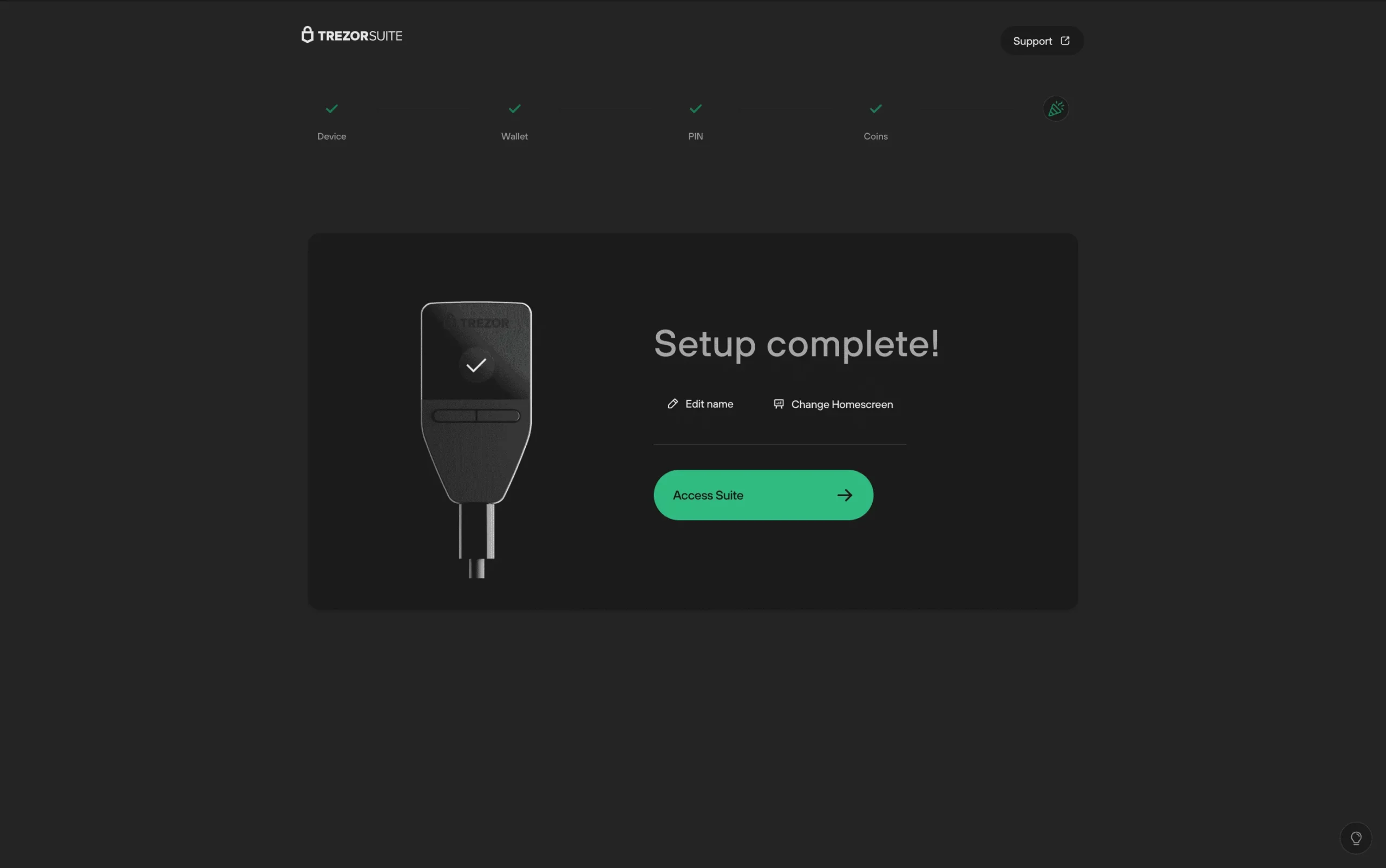 در پایان، میتوانید نامی برای دستگاه خود انتخاب کرده و تصویر پسزمینهی آن را تغییر دهید. هر دو عمل باید روی دستگاه تأیید شوند. سپس گزینهی Access Suite را بزنید تا وارد محیط اصلی کیف پول شوید.