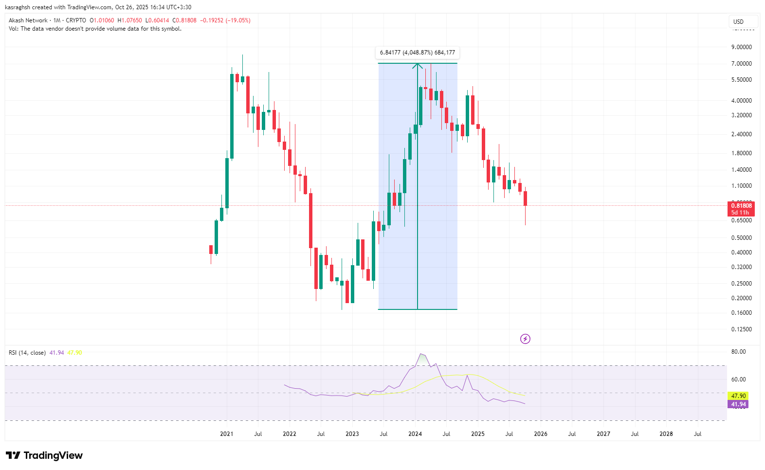 آکاش نتورک با نماد AKT‌ در اواخر سال ۲۰۲۰ که وارد بازار کریپتو شد، توانسته بود در تاب و تاب بازار آن زمان تا قیمت‌های نواحی ۸ دلار رشد کند. (ATH = 8.08 دلار) پس از آن سال با شروع بازار رکودی در بحبوحه کرونا، آکاش هم نزول خود را آغاز کرد و ریزش سنگینی را تا کف ۱۶ سنت در تاریخچه قیمتی خود ثبت کرد؛ یعنی بیش از ۹۷ درصد ریزش!