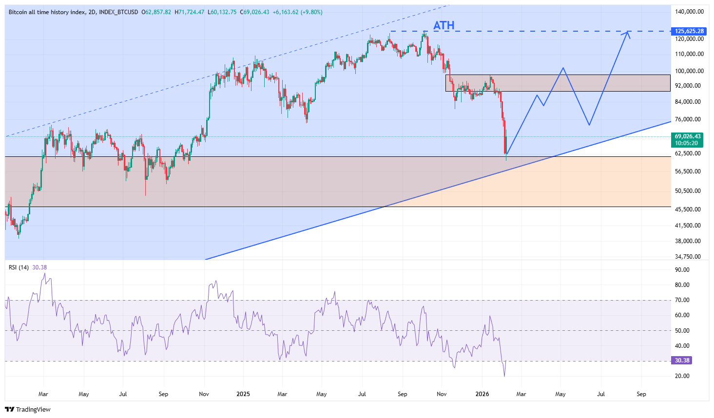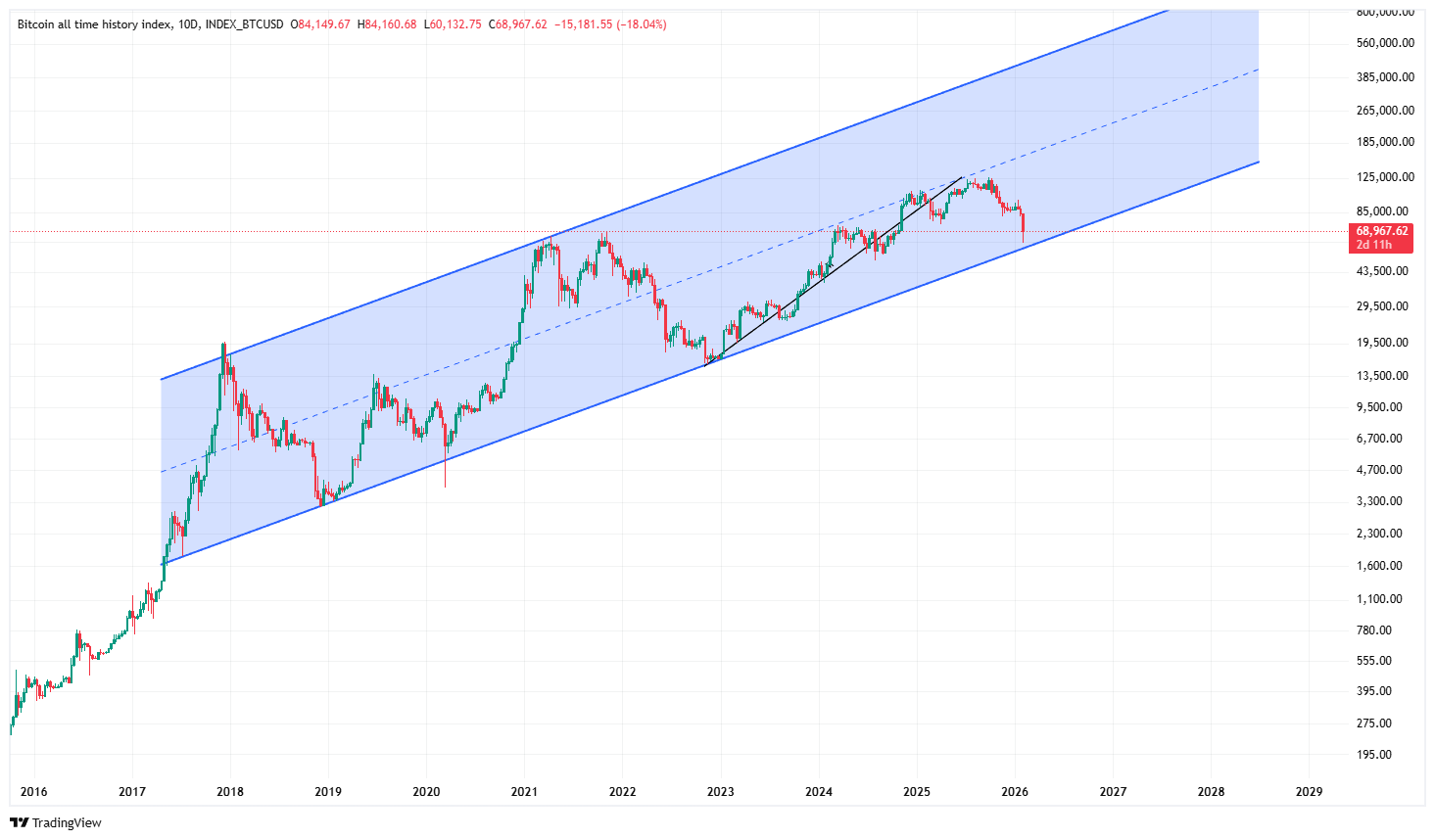 تحلیل را طبق روال همیشه از قسمت تکینکال شروع میکنیم؛ جایی که در چارت بلندمدتی یعنی در تایم فریم ۱۰ روزه میبینیم که قیمت بیت کوین در یک کانال صعودی در حال حرکت است و سقف و کف کانال و علی الخصوص میدلاین آن به خوبی اعتبار این کانال را با واکنشهایی که نشان دادهاند، بالا بردهاند. حال پس از یک ریزش تقریبا ۵۰ درصدی از میدلاین کانال (محدوده ۱۲۵ هزار دلار) به کف کانال در قیمتهای حوالی 60 هزار دلار) رسیدهایم.