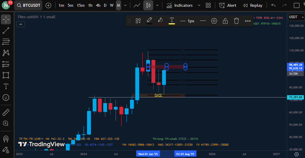 در این تحلیل تلاش شده است بر پایهی اصول پرایس اکشن و رفتارشناسی قیمت، نگاهی دقیق به روند بیتکوین در تایمفریمهای بلندمدت ماهانه، هفتگی، و روزانه داشته باشیم و محتملترین سناریوهای حرکتی پیش رو را بررسی کنیم.