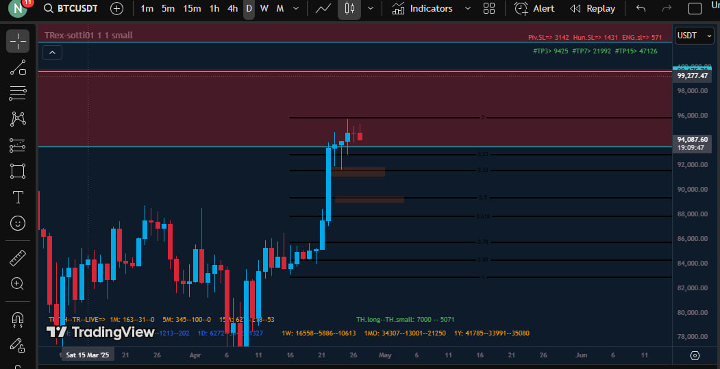 در تایم تریگر روزانه (Daily)، محدودههای گره را دقیقتر مشخص کردیم. گرهی ۵۰ درصدی شکسته شده و قیمت به گرهی مهم ۶۱.۸ درصدی رسیده است. این ناحیه میتواند محل واکنش قیمت باشد. در صورت شکست آن، گرهی بعدی یعنی RTP هدف بعدی بازار خواهد بود.