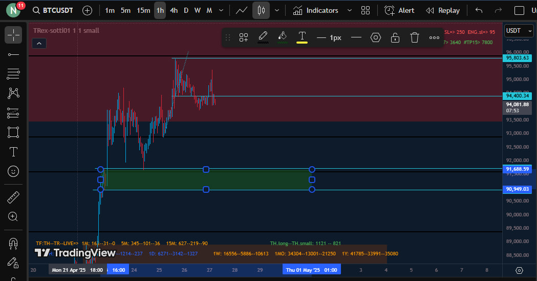 در نهایت، برای اجرای دقیقتر استراتژیهای معاملاتی، به تایم تریگر یک ساعته رفتیم. در این تایمفریم محدودهی گرههای یکسوم و ۵۰ درصد به صورت رقیق ترسیم شد.