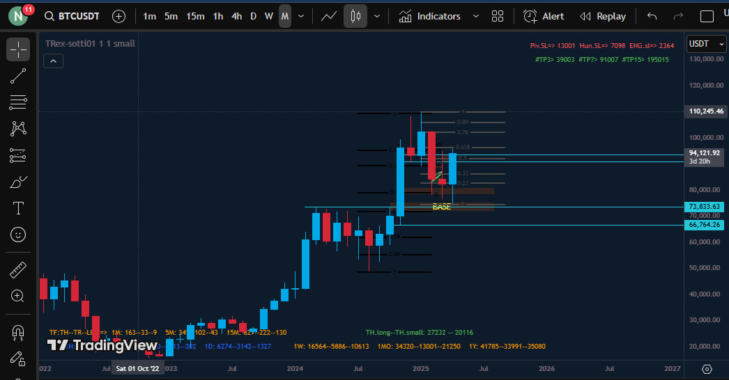 در این تحلیل تلاش شده است بر پایهی اصول پرایس اکشن و رفتارشناسی قیمت، نگاهی دقیق به روند بیتکوین در تایمفریمهای بلندمدت ماهانه، هفتگی، و روزانه داشته باشیم و محتملترین سناریوهای حرکتی پیش رو را بررسی کنیم.