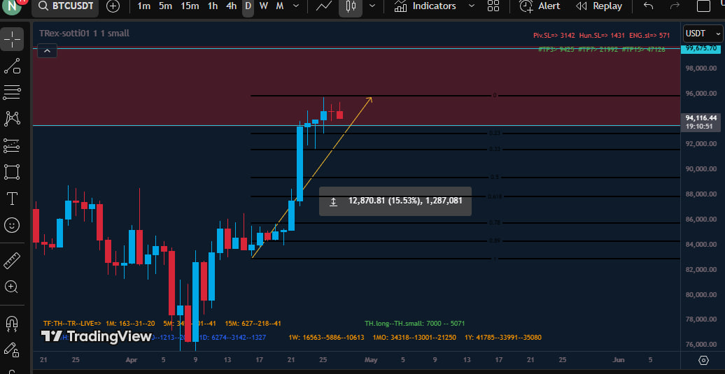 در تایم تریگر روزانه (Daily)، محدودههای گره را دقیقتر مشخص کردیم. گرهی ۵۰ درصدی شکسته شده و قیمت به گرهی مهم ۶۱.۸ درصدی رسیده است. این ناحیه میتواند محل واکنش قیمت باشد. در صورت شکست آن، گرهی بعدی یعنی RTP هدف بعدی بازار خواهد بود.