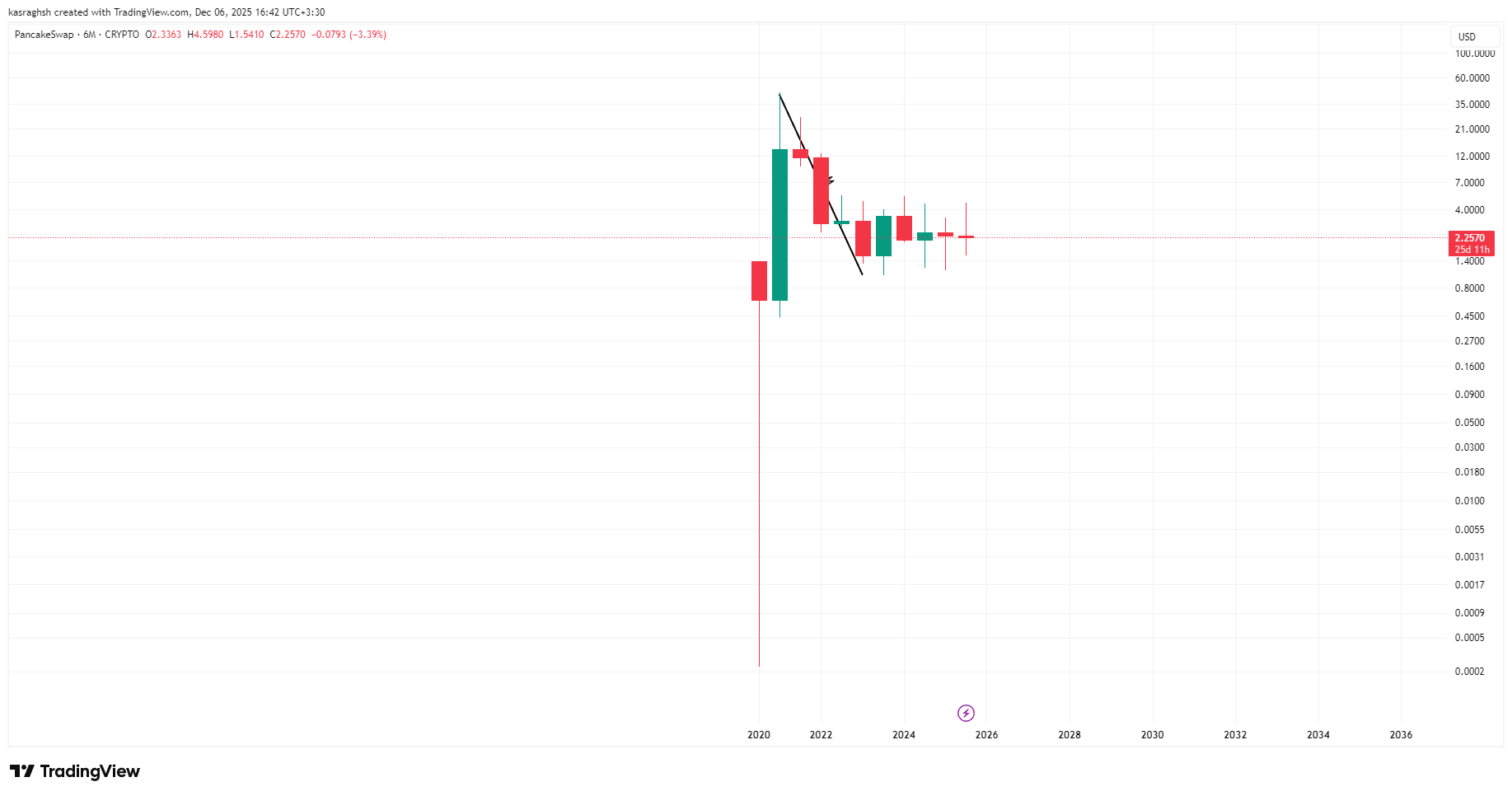 در تحلیل بلندمدت CAKE، چارت یک حقیقت غیرقابل انکار را نشان می‌دهد: ساختار نزولی تایم‌فریم ۶ ماهه هنوز سالم و دست‌نخورده است. لگ سنگین نزولی از محدوده ۴۴ دلار تا ناحیه ۱ دلار نه‌تنها اصلاح نشده، بلکه گره تصمیم‌گیری ۵ دلاری نیز چندین بار قیمت را به عقب رانده و فاز رنج میان این دو سطح عملاً تثبیت شده است. این رفتار چارت دقیقاً همان چیزی است که در سبک تیرکس با عنوان «ستاپ ادامه‌دهنده لگ ساختاری» شناخته می‌شود و اساس آن بر ادامه مسیر نزولی است.