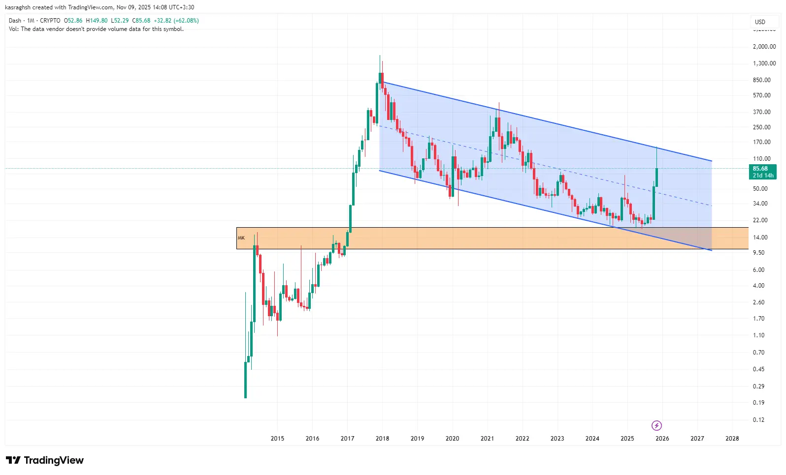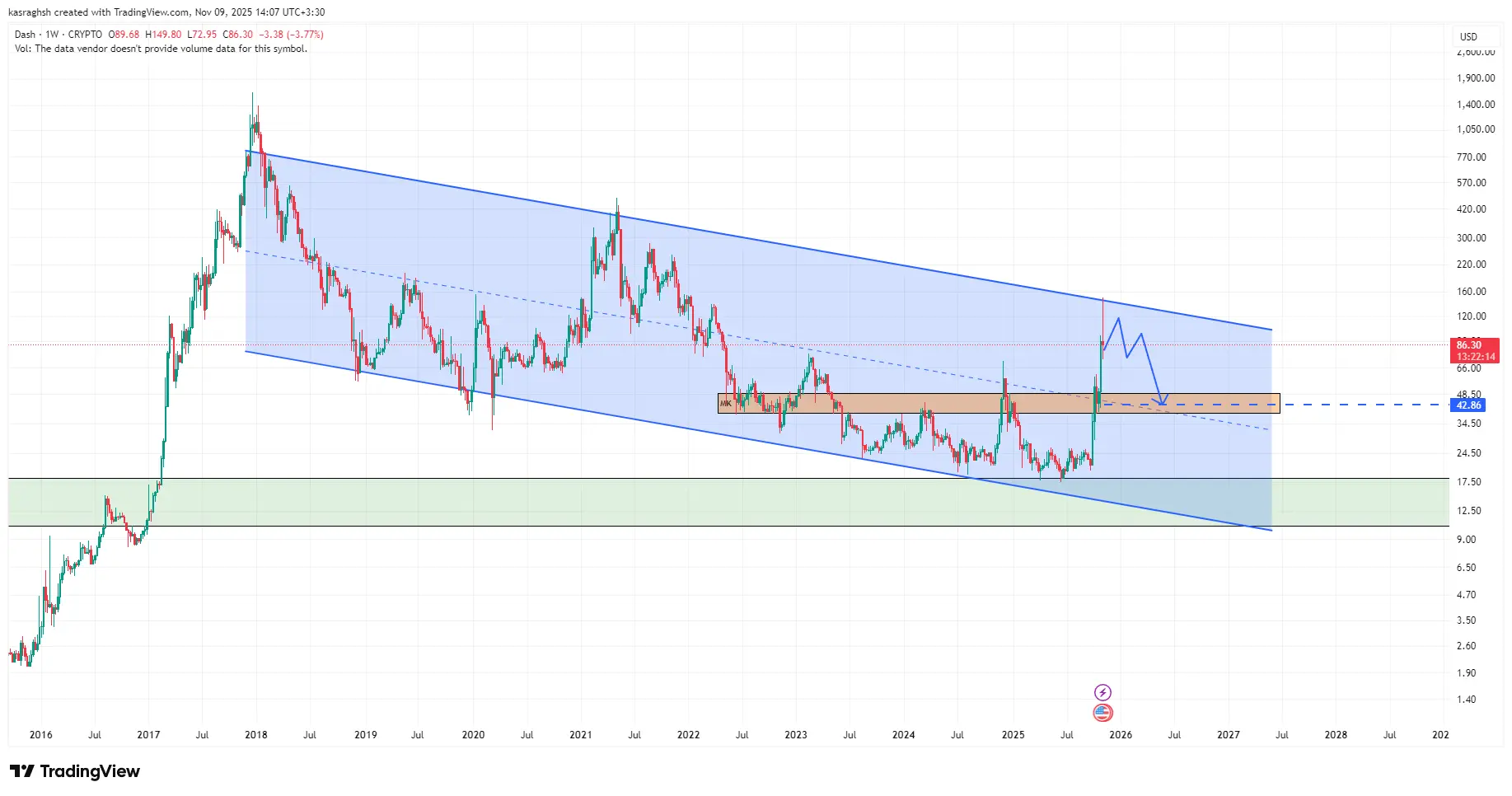 تحلیل قبلی که در تاریخ ۱۸ آبان منتشر شد، روی یک نکته کلیدی تأکید داشت: رشد نزدیک به ۸ برابری دش کوین بدون یک اصلاح جدی قابل‌دوام نیست و بهترین تصمیم برای هولدرهایی که در قیمت‌های زیر ۵۰ دلار وارد شده بودند، سیو سود است. این هشدار دقیقاً همان‌طور که انتظار می‌رفت به‌سرعت محقق شد. دش کوین پس از لمس محدوده ۱۵۰ دلار و واکنش سنگین به سقف کانال تایم‌فریم بالا، وارد فاز اصلاح شد و طی هفته‌های بعد تا محدوده ۵۲.۸ دلار سقوط کرد. اکنون که قیمت در محدوده ۵۶.۹۶ دلار قرار دارد، مسیر حرکت دش عملاً همان مسیری است که در تحلیل قبلی ترسیم شد و هنوز تغییری در سناریوی اصلی ایجاد نشده است.