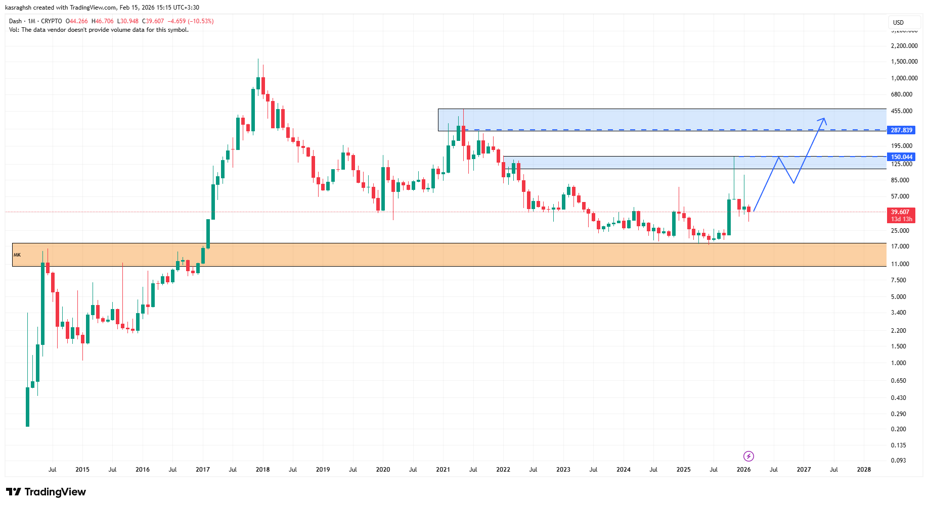 حجمی که ماه گذشته ثبت شد برایم اهمیت زیادی دارد. بالاترین حجم تاریخ دش روی یک کندل صعودی شکل گرفته است. این یعنی ورود پول هوشمند با تمایل خرید. معمولا وقتی رکورد حجم روی کندل سبز ثبت می‌شود، ادامه‌دار بودن حرکت محتمل‌تر است. اگر بازار قصد توزیع داشت، انتظار داشتم این حجم روی کندل‌های نزولی دیده شود. فعلا چنین نشانه‌ای نمی‌بینم.