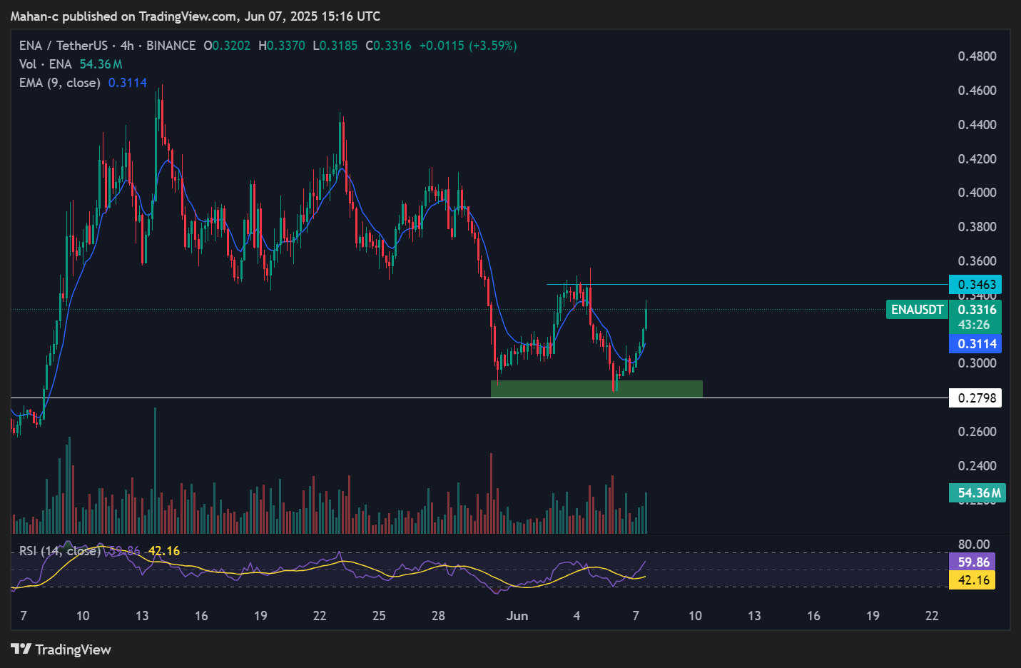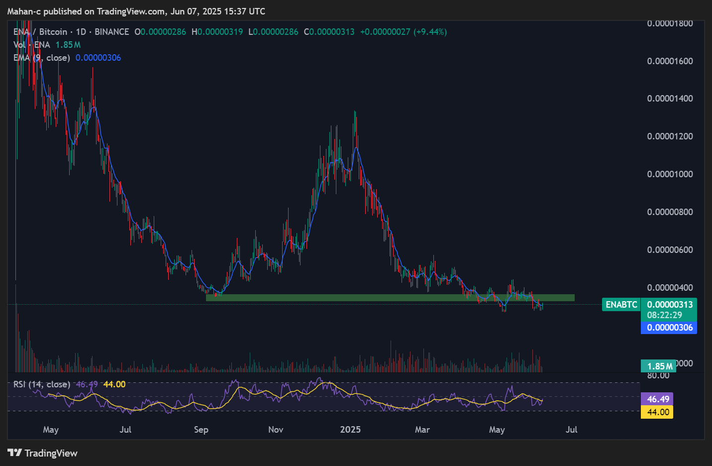 در جفت بیت کوینی آن نمودار ENA/BTC در تایمفریم روزانه یک ساختار نزولی بلندمدت را نشان میدهد، ولی در حال حاضر قیمت در ناحیه حمایتی بسیار حیاتی قرار دارد که در گذشته چندین بار نقش لانچ زون را ایفا کرده. این ناحیه حمایتی سبز رنگ بین حدود 0.00000280 تا 0.00000320 BTC واقع شده که در دو چرخه گذشته (اواخر 2023 و تابستان 2024) منجر به شروع موجهای صعودی قوی شده است. هرچند که به نظر میرسد آخرین حمایت خود را هم در برابر جفت بیت کوینی از دست داده است . در حال حاضر قیمت روی 0.00000313 قرار دارد و موفق شده در یک کندل صعودی قوی بیش از 9٪ رشد کند، که این رشد در محدوده حمایتی با حجم نسبتاً مناسب رخ داده، و نشاندهنده ورود تقاضای فعال به بازار است. EMA 9 روزه (0.00000306) اکنون توسط قیمت به بالا شکسته شده و اگر تثبیت بالای آن صورت گیرد، میتواند تاییدی برای پایان فاز اصلاح باشد. از منظر پرایس اکشن، قیمت فعلاً یک الگوی «کف دوگانه» بالقوه را در منطقه حمایت ساخته و اگر موفق به شکست ناحیه مقاومتی 0.00000350 تا 0.00000380 شود، احتمال رشد تا اهداف بالاتر مانند 0.00000450 و 0.00000580 افزایش خواهد یافت. نکته مهم این است که نسبت ENA/BTC به شدت به عملکرد بیتکوین وابسته است. اگر بیت کوین ریزش کند، احتمال دارد که حتی با رشد دلاری ENA، نسبت ENA/BTC فشار فروش داشته باشد. بنابراین این چارت بیشتر برای کسانی مفید است که جفت ارزها را معامله میکنند و نه صرفاً برای بررسی قیمت دلاری این ارز.