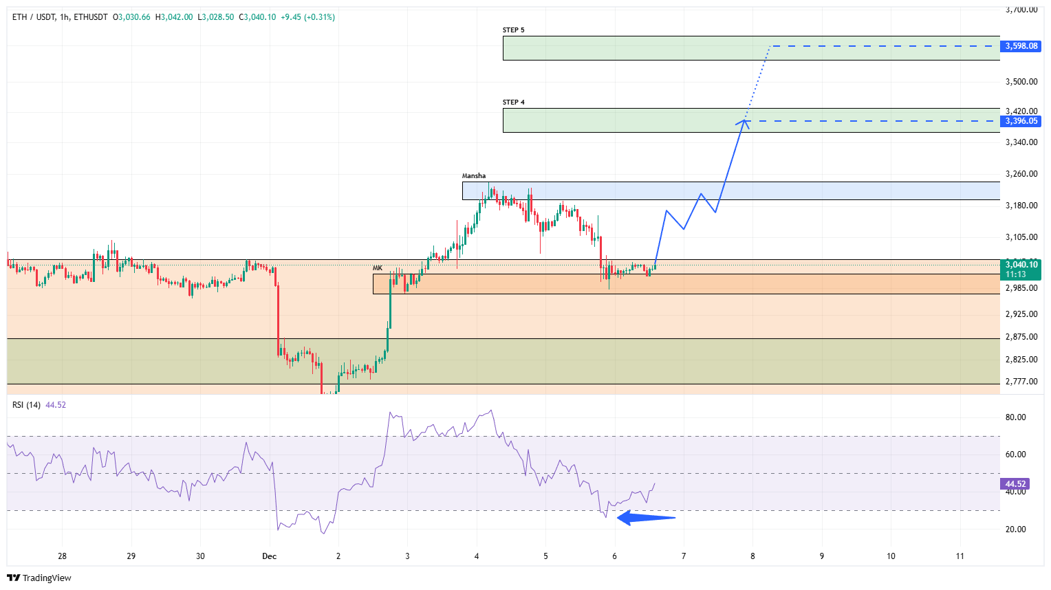در این مرحله باید محدوده حمایتی و گره تصمیمگیری این لگ صعودی را در ناحیه تخمینی یک سوم بالایی لگ بتوانیم تشخیص دهیم. بنابراین نیاز هست تا به تایم فریم تریگر تحلیل که یک ساعته است برویم. در تایم فریم یک ساعته گره تصمیم گیری در ناحیه حمایتی 2973 تا 3000 دلار دیده میشود. اتفاقا گام شماری لگ نزولی تایم فریم یک ساعته هم در محدوده گام پنجم، در دل گره تصمیمگیری قیمتی که به ان واکنش صعودی داده است را نشان میدهد؛ این موضوع میتواند گواه بیشتری مبنی بر پایان اصلاح تایم فریم یک ساعته باشد.