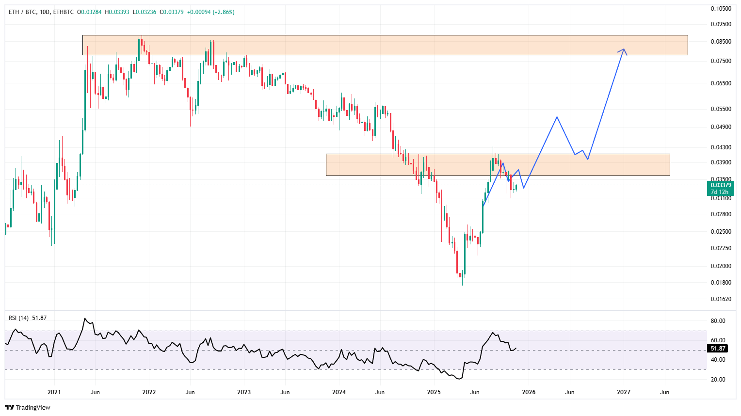 نسبت ETH/BTC در دل یک ساختار ادامه‌دهنده سالم قرار دارد و اگر حمایت فعلی حفظ شود، حرکت ۵۰ درصدی در این نسبت کاملاً محتمل است.