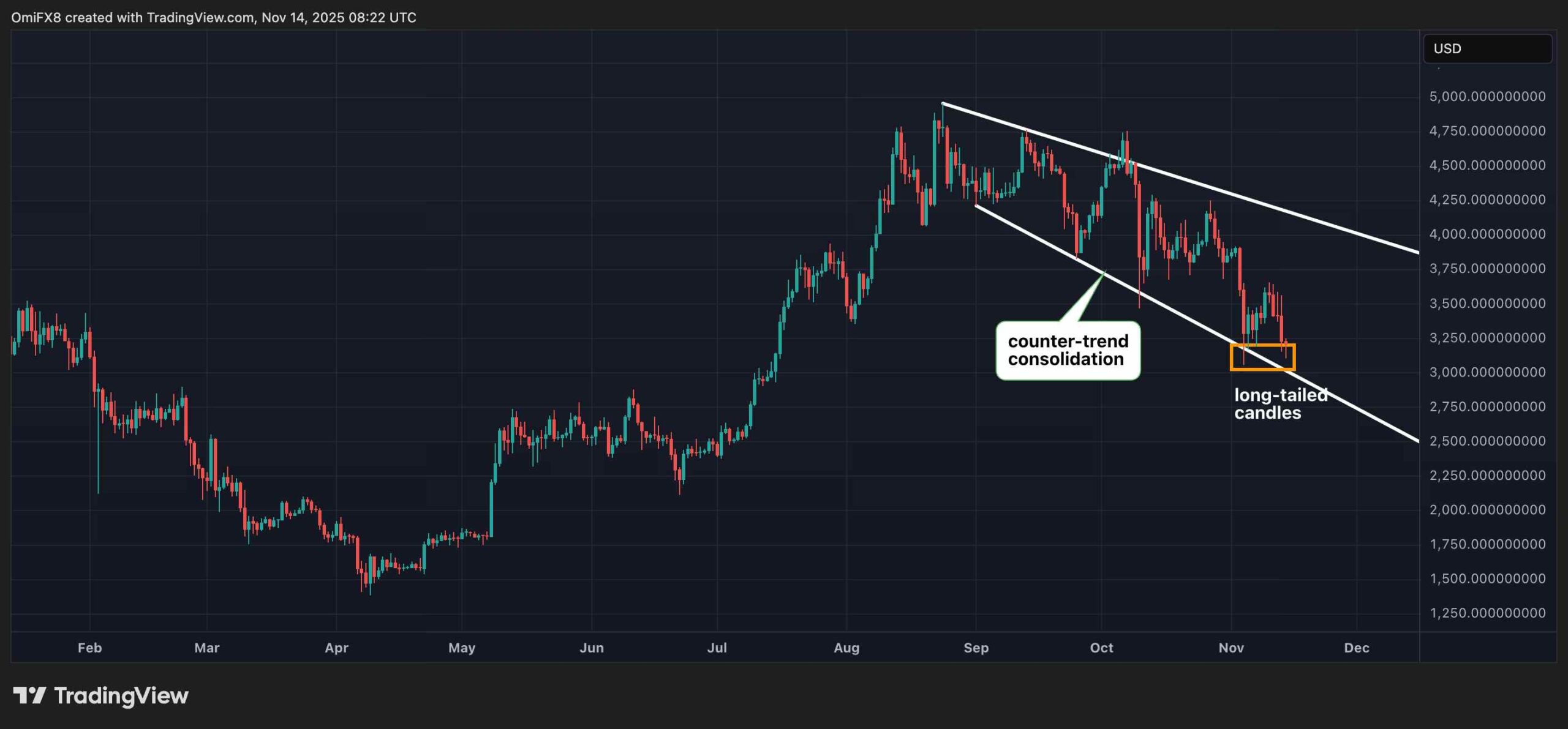 در کنار نسبت ETH/BTC، چارت دلاری اتریوم نیز پیام‌های مشابهی دارد. قیمت در یک کانال نزولی اصلاحی حرکت می‌کند، با سایه‌های بلند کف کندل‌ها نزدیک محدوده ۳۰۰۰ دلار. این الگو نشانه واضح خستگی فروشندگان است؛ فروش فشار دارد، اما خریداران هر بار کف را جمع می‌کنند. بنابراین ساختار فعلی بیشتر شبیه آماده‌سازی برای یک بازگشت است تا شروع یک روند نزولی سنگین.