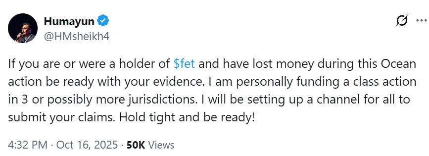 در هفتههای اخیر، همايون شیخ، مدیرعامل Fetch.ai، در پلتفرم X اتهاماتی جدی را علیه Ocean مطرح کرد و مدعی شد این پروژه پیش از ادغام، میلیونها توکن OCEAN ضرب کرده و سپس بخشی از آنها را به FET تبدیل و به صرافیها انتقال داده است. بر اساس گزارشها، حجم این توکنها حدود ۲۸۶ میلیون FET، معادل ۸۴ میلیون دلار است. در پی این اتهامات، Ocean Protocol پاسخ تندی منتشر کرد و تمام ادعاها را "شایعات بیاساس" خواند.