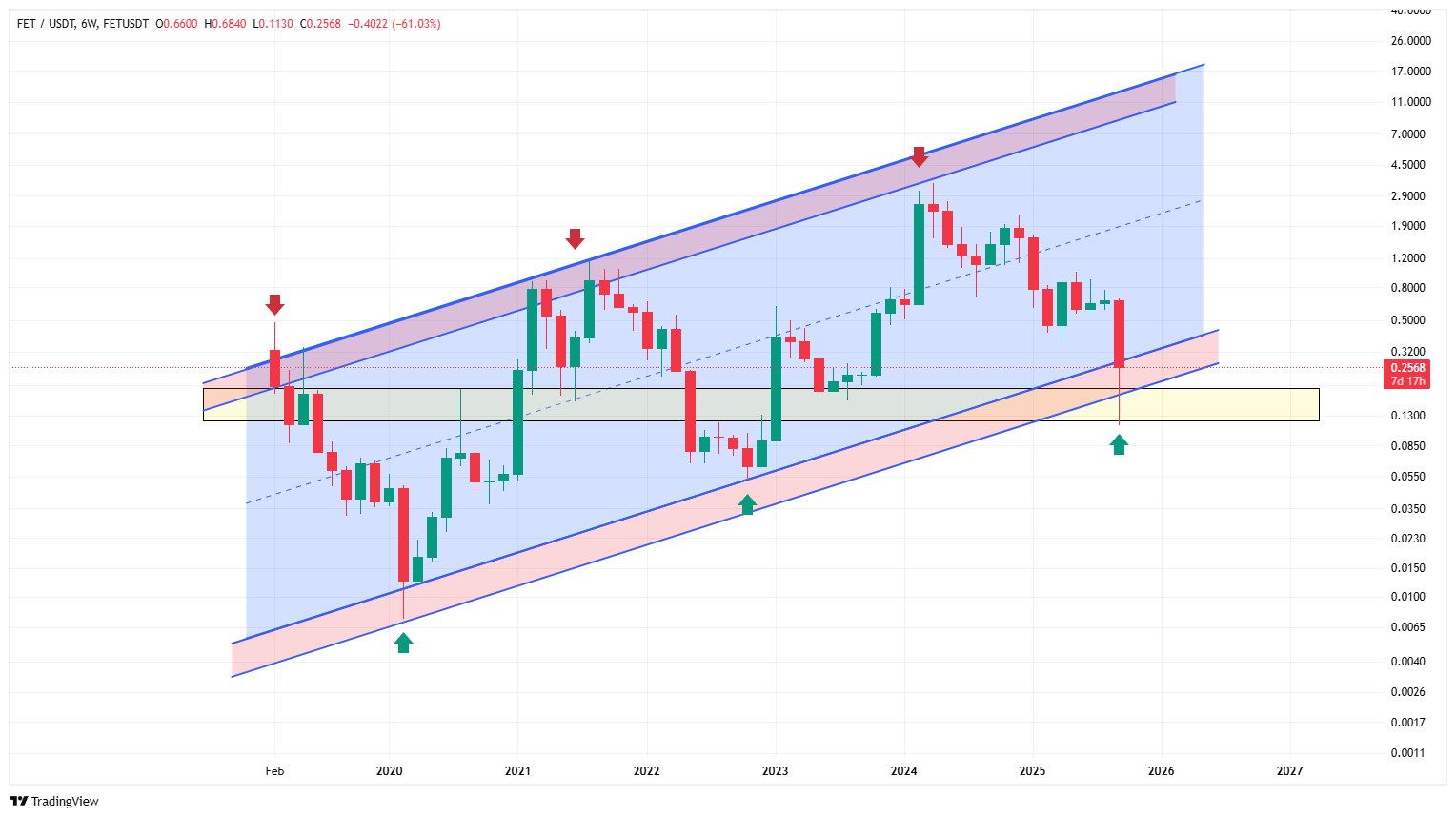 در حال حاضر نیز در نزدیکی یک محدوده حمایتی معتبر از تایم فریم بالا در حال معامله شدن است. این ارز بیشتری قیمتی که به خود دیده است، قیمتهای حوالی 3.4 دلار است، اما در حال حاضر در قیمت ۲۵ سنت در حال معامله است؛ یعنی نزدیک به ۹۵ درصد پایینتر از سقف تاریخی. ممکن است اینطور با خود فکر کنید که خب دیگر کار این پروژه تمام است و نمیتواند سقف جدیدی داشته باشد، اما نگاهی به تاریخچه قیمتی این ارز نشان میدهد که همچین رفتاری در گذشته نیز بوده است و دو بار دیگر نیز FET بیش از ۹۰ درصد اصلاح داشته،اما توانسته در رشدهای بعدی بازار سقف جدیدی داشته باشد.