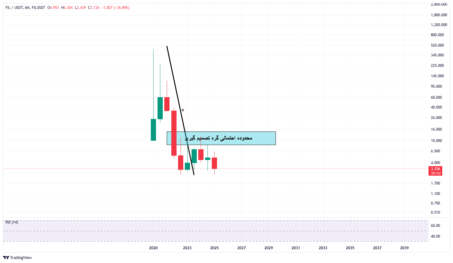 در نگاه اول اهداف پروژه جذاب به نظر می‌رسد؛ اما سبک معاملاتی ما چه چیزی را نشان می‌دهد؟ تحلیل تکنیکال فایل کوین به سبک تیرکس را از تایم فریم بالا یعنی شش ماهه شروع میکنیم تا بتوانیم نگاهی بلندمدتی نسبت به آن پیدا کنیم. در تایم فریم شش ماهه لگ اصلی را تشخیص می‌دهیم؛ حداقل سه کندل در یک راستا و اولین کندل رنگ مخالف را دیده و کار ما شروع می‌شود. در نگاه اول متوجه می‌شویم که این رمزارز نتوانسته است در نهایتا دو کندل گره تصمیم گیری خود را انگلف و ستاپ برگشتی را برای ما فعال کند؛ اتفاقا ستاپ ادامه دهنده آن لگ نزولی برایمان فعال شده است.