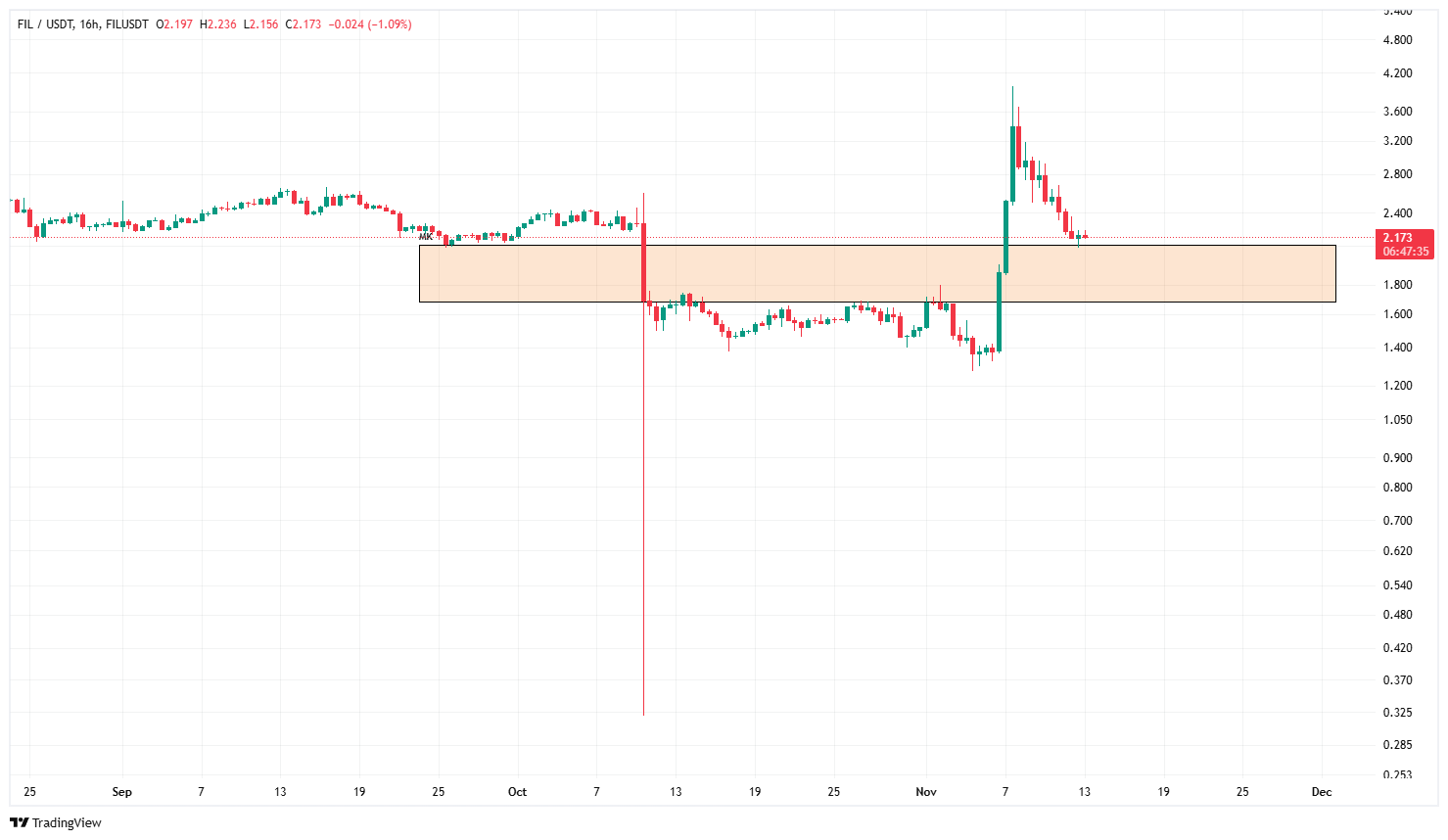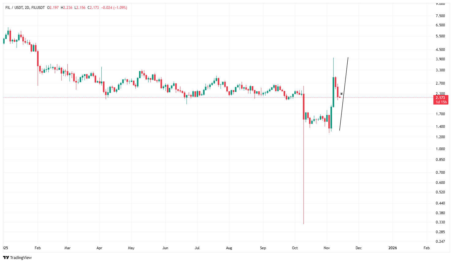 چارت قیمت فایل کوین پس از ریزشی که پس از انتشار خبر تعرفه‌های ترامپ بر چین رخ داد، اکثر استاپ‌لاس‌ها را زده و تمامی سفارشات را جمع کرده است و با شدویی بزرگ به قیمت‌های قبل از ریزش برگشته است. پس از ریکاوری بازار کریپتو بعد از ریزش بازار، فایل کوین چندی پیش حرکت صعودی شارپی را در تایم فریم ۲ روزه تشکیل داد که از نگاه سبک تیرکس می‌تواند جزو لگ‌های قدرتمندی باشد تا بتوان تحلیل را از آن شروع کرد. این لگ قدرتمند از قیمت 1.27 دلار شروع شده و تا نزدیک 4 دلار ادامه داشته است.