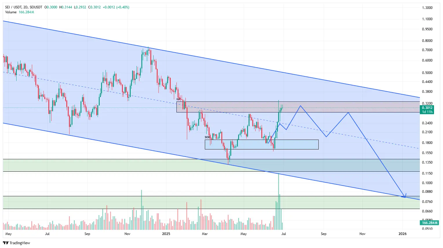 همانگونه که پیشبینی شد، SEI از همان محدوده کمریسک شروع به رشد کرد و طی چند هفته تا محدوده ۳۰ سنت بالا رفت. در ادامه این حرکت، در ۹ تیر ۱۴۰۴ تأکید شد که این ناحیه میتواند سقف اصلاح موقت باشد و در صورت پاکسازی مقاومت، احتمال تغییر فاز از نزول به صعود وجود دارد. اما بازار نتوانست از این مقاومت عبور کند و رفتار قیمت دقیقاً مطابق سناریوی دوم – یعنی آغاز حرکت نزولی جدید – شکل گرفت.