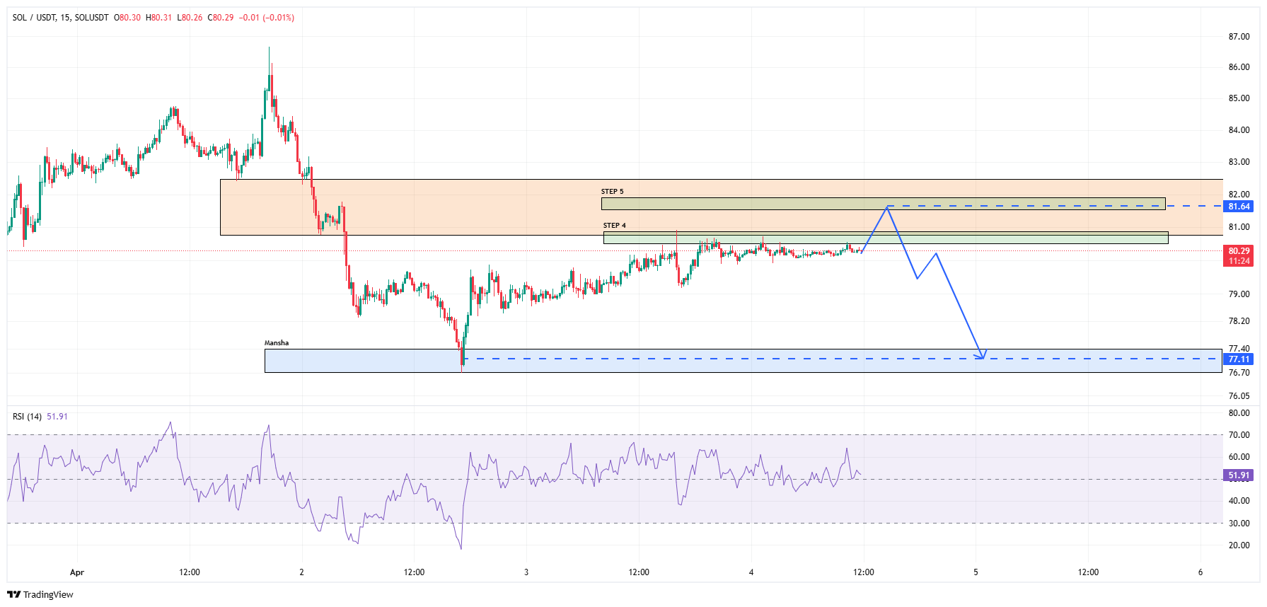 در این تحلیل قصد دارم تا نگاهی به چارت سولانا در تایم فریم کوتاهمدتی ۱ ساعته بیندازم. در حالی که در تایم فریمهای ساختار ۴ ساعته یا ۱۶ ساعتع یک لگ نزولی پرقدرت میبینیم در تایم فریم پترن این ساختار با جزئیات بیشتری قابل مشاهده است. همانطور که در تصور هم مشخص شده، قیمت چارت سولانا در محدوده قیمت ۸۰ دلار یک گره تصمیمگیری دارد که قیمت در حال نزدکیتر شدن به آن است.
