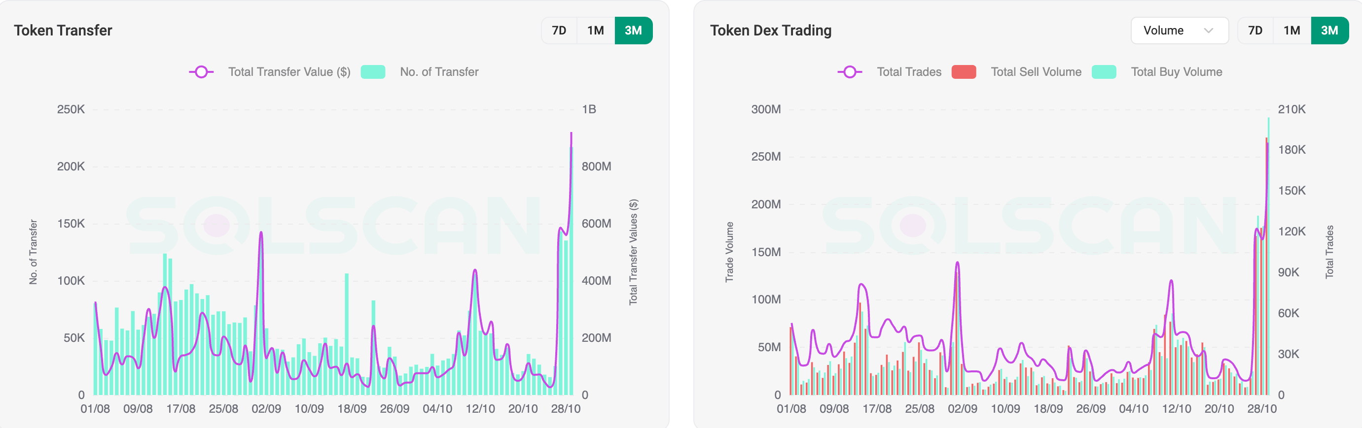 افزایش چشمگیر حجم معاملات در شبکه سولانا نیز تأییدی دیگر بر بازگشت تقاضا است. دادههای Solscan بیانگر آن است که حجم تراکنشها و معاملات DEX مرتبط با توکن ترامپ به بالاترین میزان در سه ماه گذشته رسیده است. نکته قابل توجه، غلبه حجم خرید بر فروش در این دوره است؛ عاملی که نشان از بازگشت تقاضای واقعی و نه صرفاً سفتهبازی کوتاهمدت دارد.