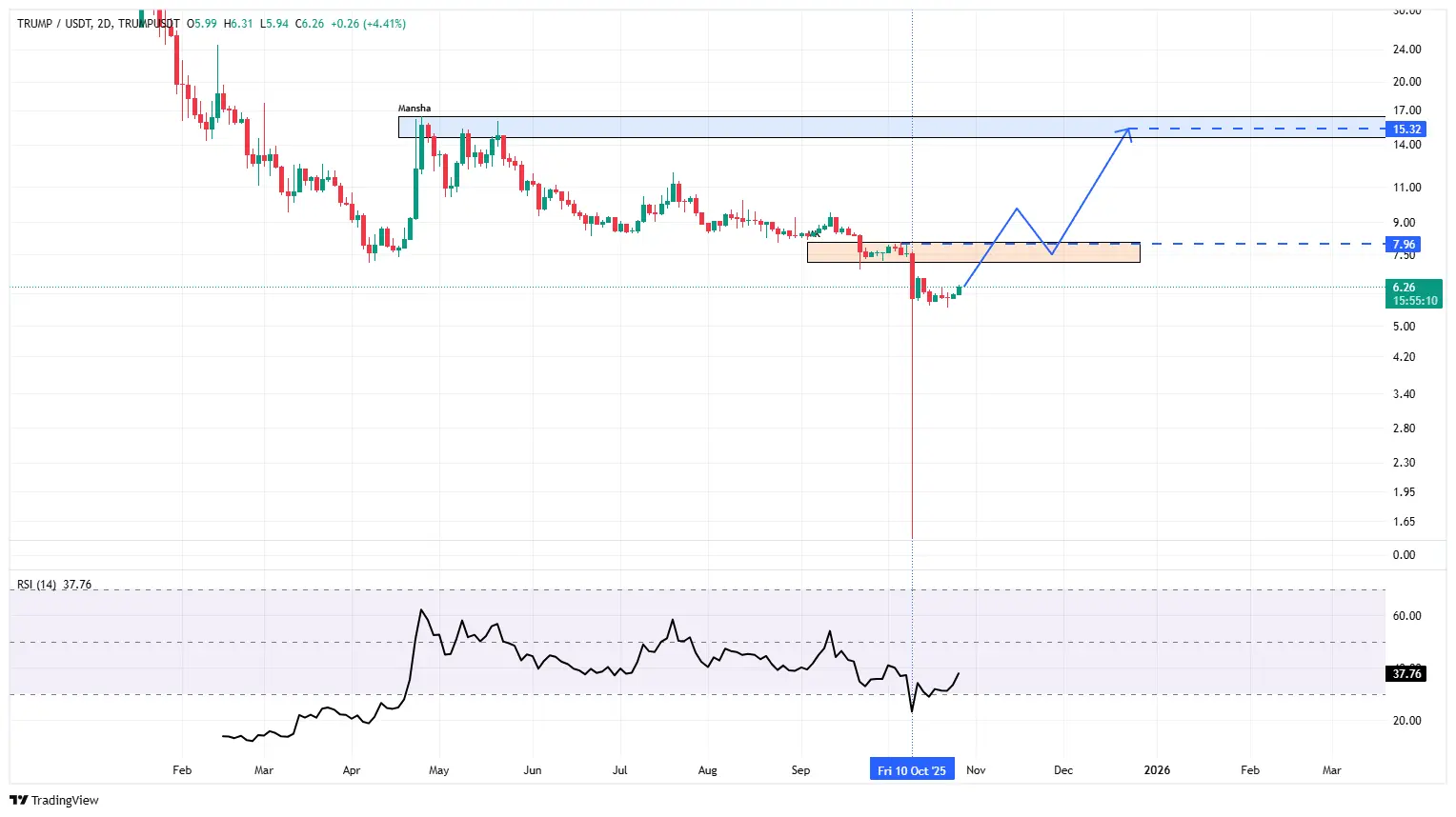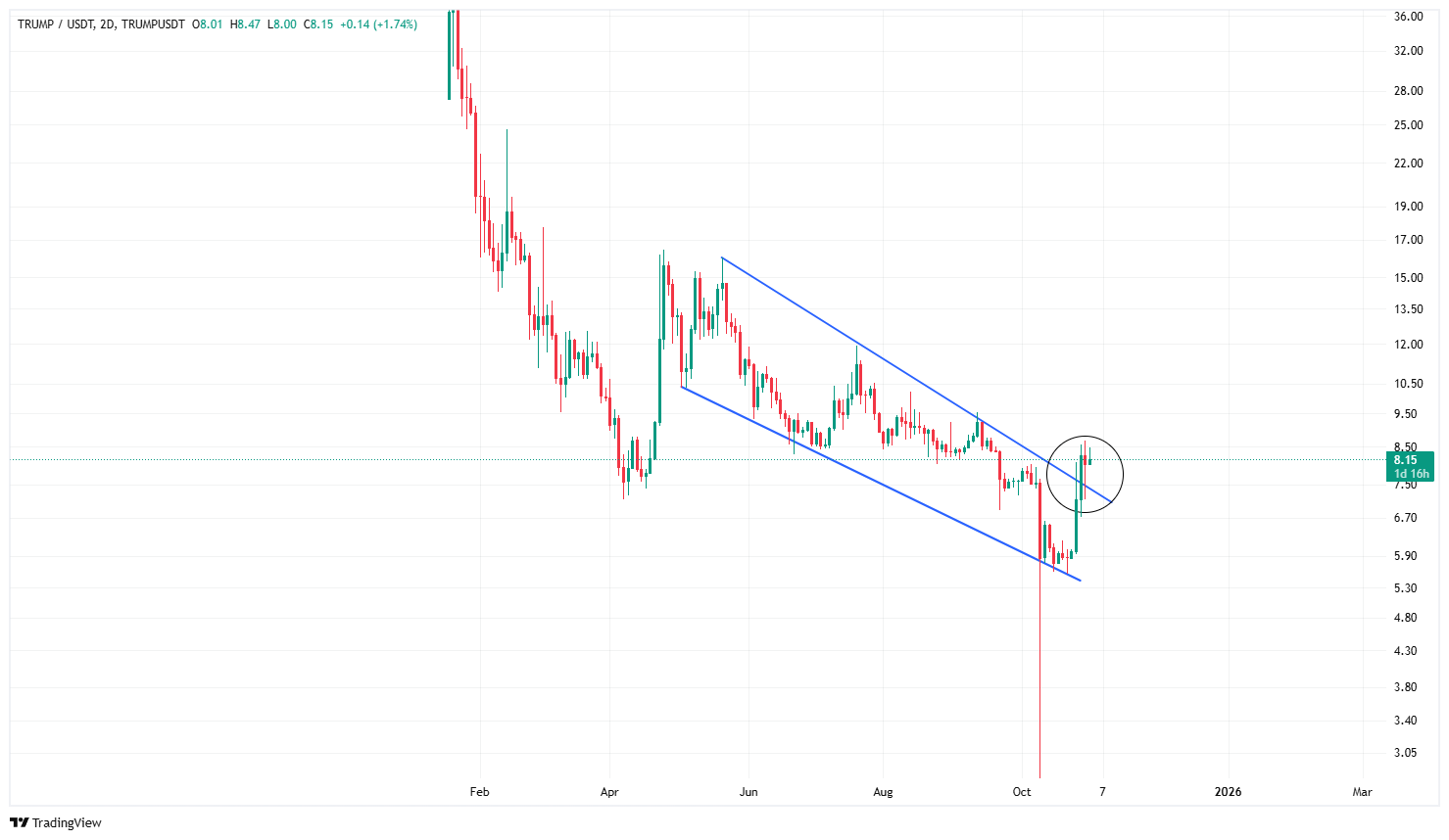 از منظر تکنیکال، دادههای اخیر منتشرشده توسط پلتفرم BeInCrypto و تحلیلگران مستقل نشان میدهد که توکن ترامپ توانسته از الگوی Falling Wedge خارج شود. این الگو معمولاً یکی از معتبرترین نشانههای بازگشت روند نزولی به صعودی است. شکست خط روند نزولی در این الگو و تثبیت قیمت بالای آن، بیانگر تغییر رفتار سرمایهگذاران از فروش به انباشت است. در صورت تثبیت قیمت بالای ۸ دلار، هدف بعدی توکن میتواند محدوده ۹ تا ۹.۵ دلار باشد که همپوشانی قابلتوجهی با مقاومتهای تاریخی پیش از سقوط بزرگ آن دارد.