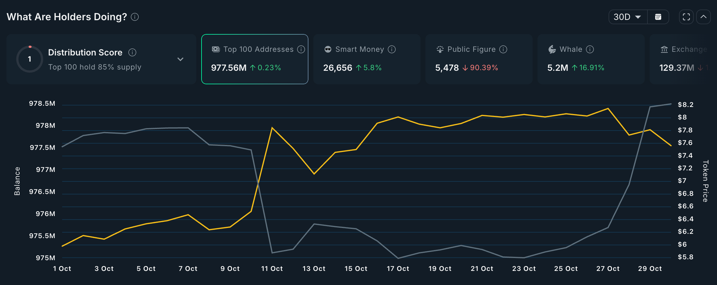 در کنار شرایط فنی مطلوب، مجموعهای از عوامل فاندامنتال نیز از بازگشت تدریجی اعتماد به توکن ترامپ حمایت کردهاند. طبق گزارش BeInCrypto، توکن TRUMP طی هفته گذشته بیش از ۴۲ درصد رشد داشته و به بالاترین سطح ششهفته اخیر خود رسیده است. یکی از دلایل اصلی این رشد، انباشت نهنگها (Whale Accumulation) و کاهش موجودی توکن در صرافیها بوده است. دادههای Nansen نشان میدهد که در ۳۰ روز گذشته، موجودی توکن ترامپ در صرافیهای متمرکز ۱.۴ درصد کاهش یافته است، که این امر معمولاً بهعنوان سیگنال مثبتی در نظر گرفته میشود و نشاندهنده کاهش تمایل به فروش در بین دارندگان بزرگ است.
