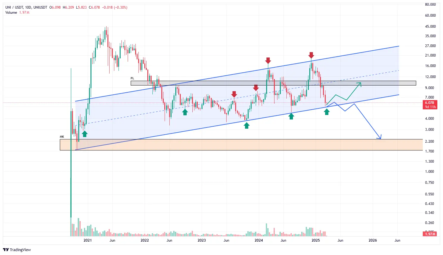 در تحلیل ۲۲ اسفند ۱۴۰۳ دو سناریوی اصلی برای حرکت یونیسواپ (UNI) در نظر گرفته شده بود. در آن مقطع قیمت در کف کانال صعودی چندساله قرار داشت و تأکید شد که واکنش به این محدوده میتواند جهت حرکت بعدی را مشخص کند. سناریوی نخست بیان میکرد که در صورت حفظ کف کانال، حرکت صعودی به سمت میدلاین و سپس سقف کانال ادامه خواهد یافت. دقیقاً همین مسیر طی شد؛ UNI طی ماههای بعد توانست از محدوده حمایتی خود بازگشت داشته باشد و تا محدوده ۱۲ دلار که حوالی مقاومت مشخص شده بود، رشد کند. این حرکت عملاً تحقق کامل سناریوی سبز رنگ تحلیل بود که بر اساس اصول تکنیکال کلاسیک ترسیم شده بود.