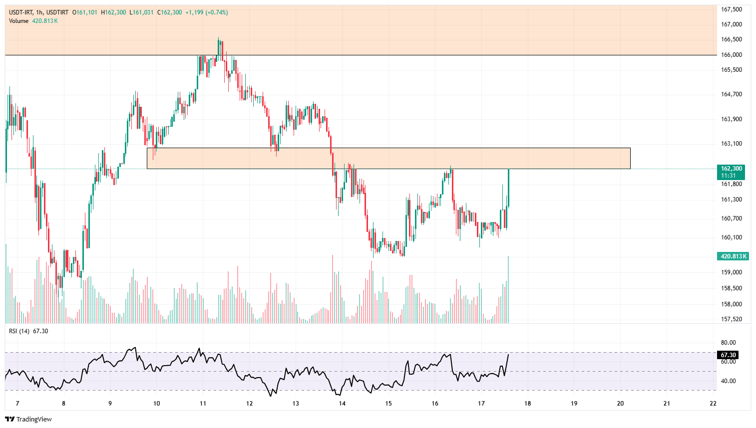 امروز می‌تواند روز حساسی برای قیمت تتر باشد. اخبار مربوط به مذاکرات ایران و آمریکا می‌تواند جو مثبت و منفی هیجانی روی قیمت دلار ایجاد کند. چارت تتر نشان می‌دهد که مهمم‌ترین مانع پیش روی قیمت برای رسیدن به سقف قبلی در حوالی ۱۶۶ هزار تومان محدوده 162 هزار و 500 تومان است. اگر طی اخباری که در ساعات آتی منتشر خواهد شد، احساسات منفی روانه فضای مجازی شود، با شکست این سطح می توان شاهد نوسان شدیدی تا حوالی ۱۶۶ هزار تومان باشیم.