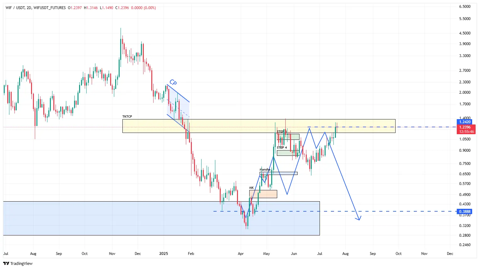 پنج ماه پیش، زمانی که بسیاری از معامله‌گران از بازار میم‌کوین‌ها ناامید شده بودند و قیمت ویف‌هت (WIFHAT) در حوالی ۳۰ تا ۴۰ سنت نوسان می‌کرد، در تحلیل منتشرشده در تاریخ ۲۰ اردیبهشت ۱۴۰۴ محدوده ۰.۳۸ دلار به‌عنوان یکی از نواحی مستعد برگشت قیمتی معرفی شد. آن زمان پیش‌بینی شد که با عبور قیمت از محدوده مقاومتی ۰.۷۹ دلار، امکان رشد تا سطح ۱.۲۴ دلار وجود دارد.