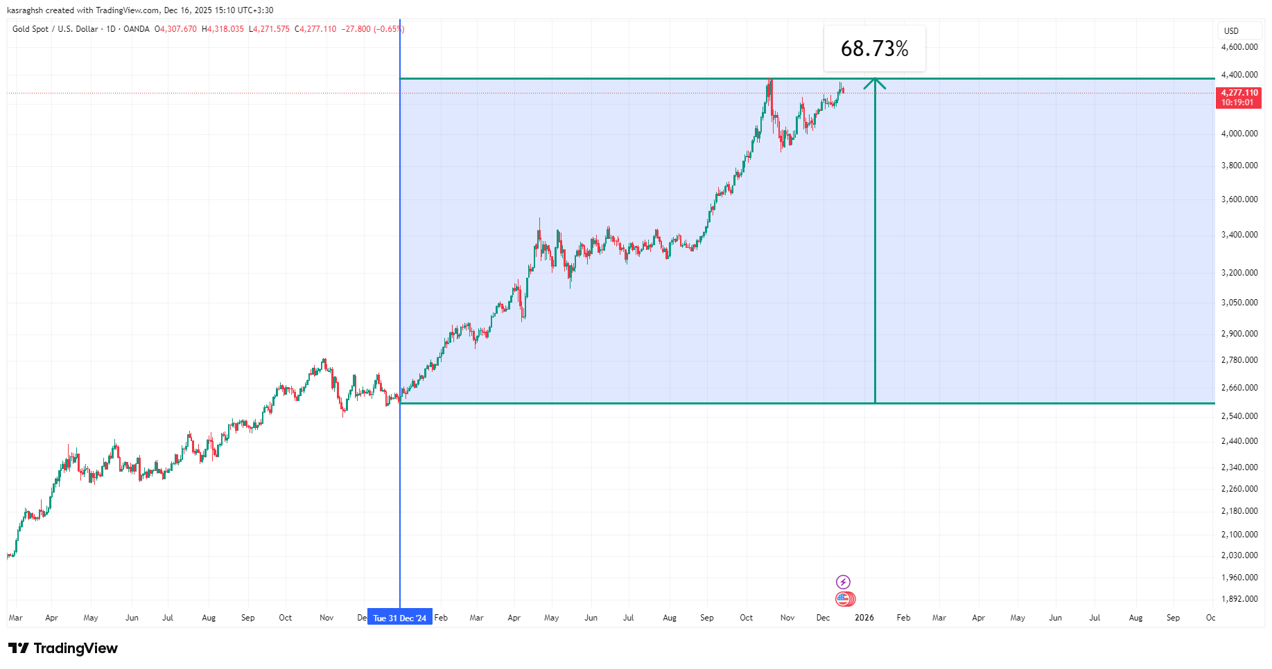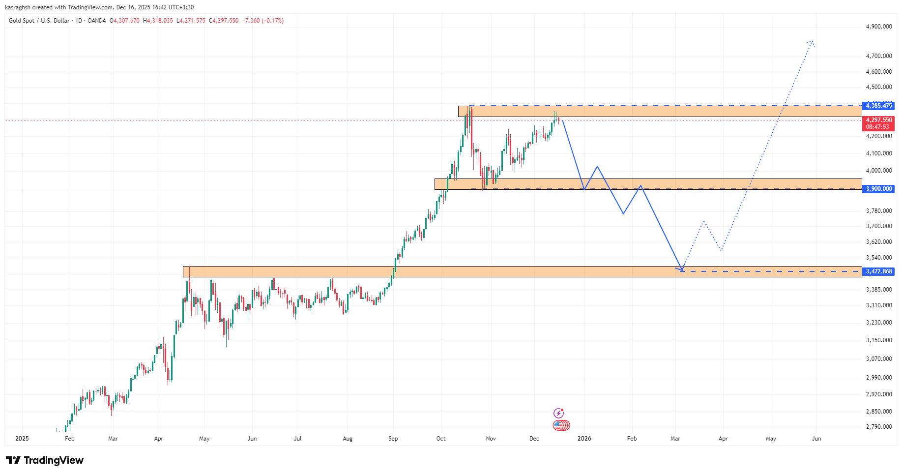 برای شروع تحلیل، ابتدا باید تصویر کلی انس جهانی را مشخص کنیم. طلا در سال ۲۰۲۵ یک لگ صعودی بسیار قدرتمند را تجربه کرده که منجر به ثبت سقف تاریخی ۴٬۳۸۱ دلار شده است. این حرکت صعودی حاصل همزمان شدن چند عامل مهم بوده؛ از تشدید ریسکهای ژئوپلیتیک گرفته تا تغییر جهت سیاستهای پولی فدرال رزرو و افزایش بیسابقه خرید طلا توسط بانکهای مرکزی. پس از این لگ صعودی پرقدرت، بازار وارد فاز اصلاح و تثبیت شده و قیمت اکنون در محدوده حوالی ۴٬۳۰۰ دلار در حال نوسان است.