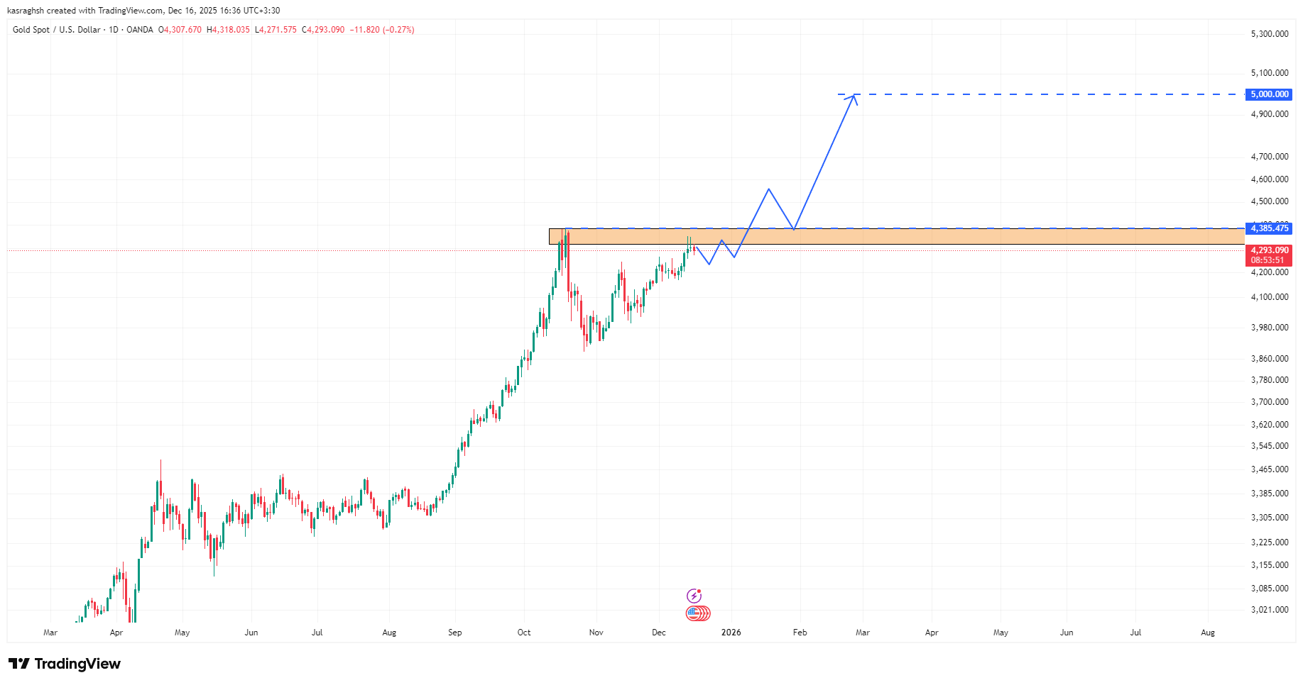 در سناریوی اول که سناریوی غالب و محتملتر است، انس جهانی موفق میشود بالای محدودههای فعلی تثبیت شود و پس از عبور مجدد از مقاومت ۴٬۳۸۱ دلار، به سمت اهداف بالاتر حرکت کند. در این حالت، تارگتهای ۴٬۵۰۰ دلار و سپس محدوده روانی ۵٬۰۰۰ دلار در دسترس خواهند بود. این همان سناریویی است که بسیاری از بانکها و مؤسسات مالی بزرگ برای سال ۲۰۲۶ مطرح کردهاند. در این مسیر، تترگلد رشد آرام، پیوسته و کمریسکی را تجربه میکند و بیشتر مناسب سرمایهگذارانی است که دید نگهداری دارند، نه تریدرهای کوتاهمدت.