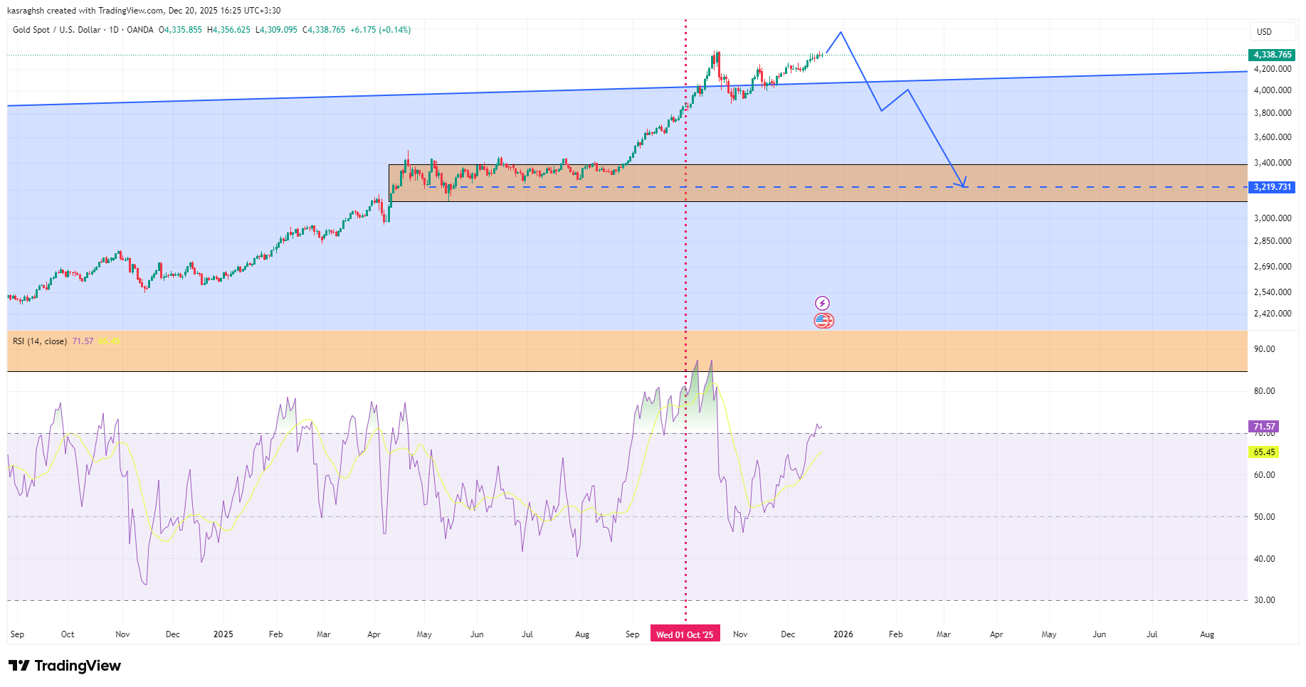 با در نظر گرفتن تمام این عوامل، شخصاً سرمایه‌گذاری یا ورود سنگین به طلا در محدوده سقف کانال صعودی و در شرایط اشباع خرید RSI را تصمیم منطقی نمی‌دانم. نسبت ریسک به ریوارد در این ناحیه جذاب نیست و بازار فضای کافی برای اصلاح یا دست‌کم درجا زدن دارد. حتی این احتمال وجود دارد که تحت شرایط خاصی، انس جهانی اصلاح عمیق‌تری را تجربه کند و به سطوح پایین‌تری مانند حوالی ۳۲۰۰ دلار برسد؛ سطحی که می‌تواند در آینده فرصت‌های جذاب‌تری برای ورود ایجاد کند.